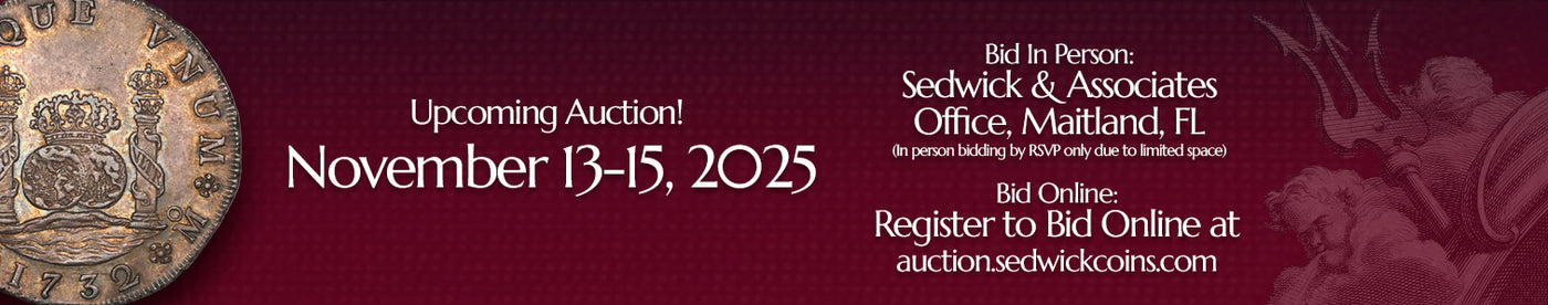 We at Sedwick & Associates, LLC are members in good standing with most major numismatic organizations, including the world’s most prestigious numismatic dealer guild IAPN (International Association of Professional Numismatists) as well as the ANS (American Numismatic Society) and ANA (American Numismatic Association), and we are fully insured and licensed Florida auctioneers (AU3635, AB2592, since 2007)