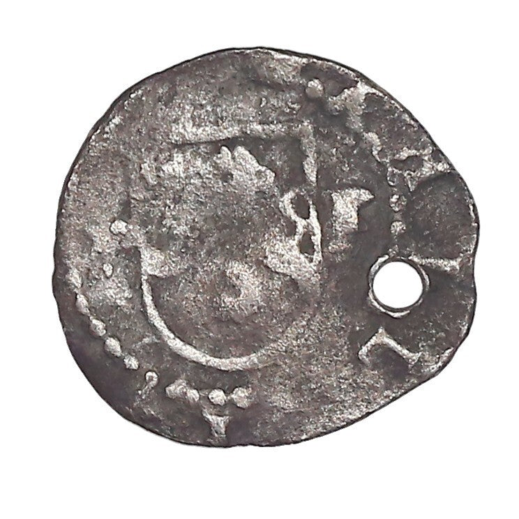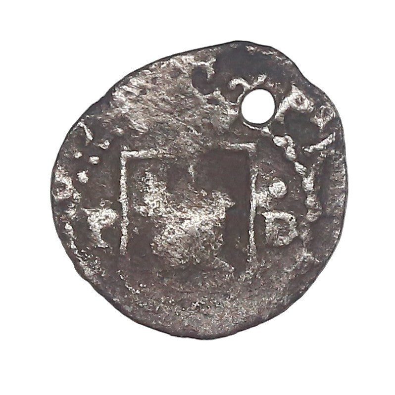 0.57 gram. Some legend, bold full P-dot-D and *-P, slightly porous Fine with some dark toning, holed to right of crown.