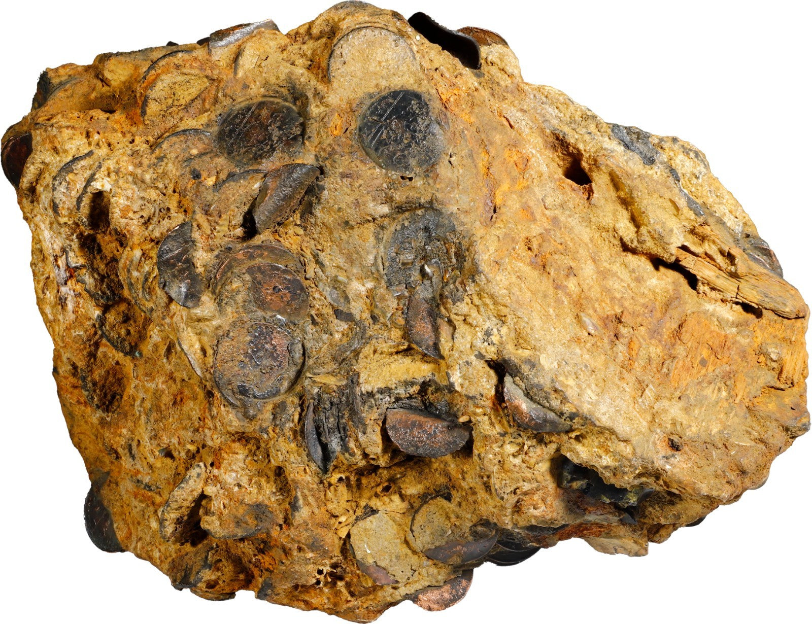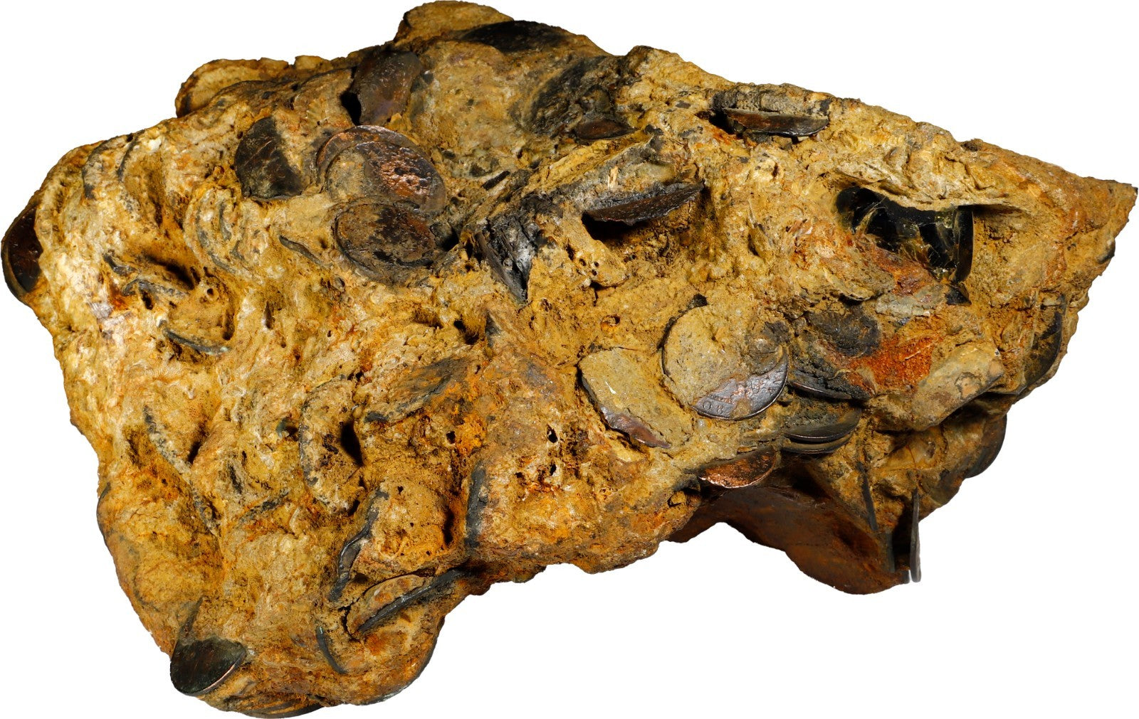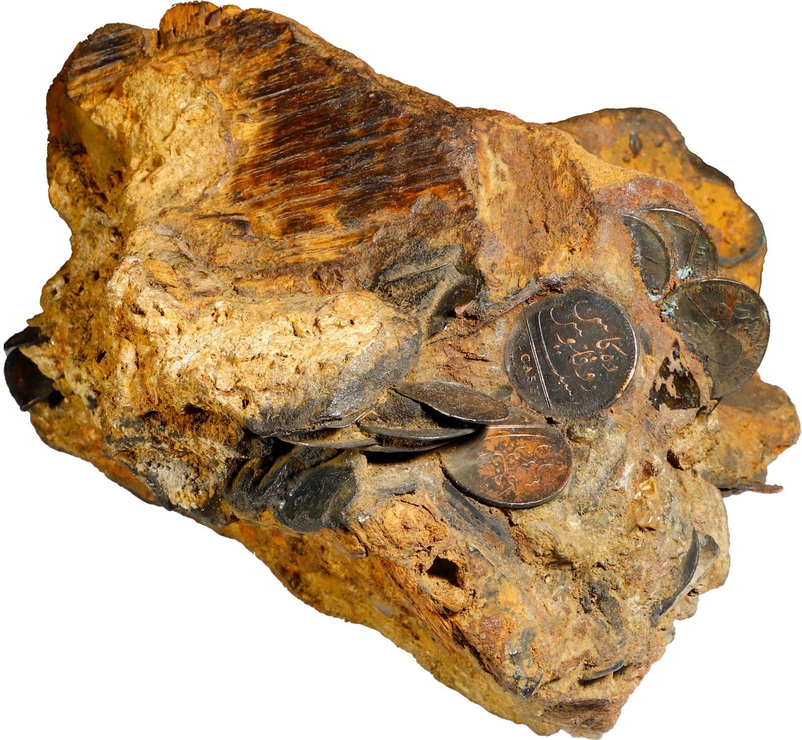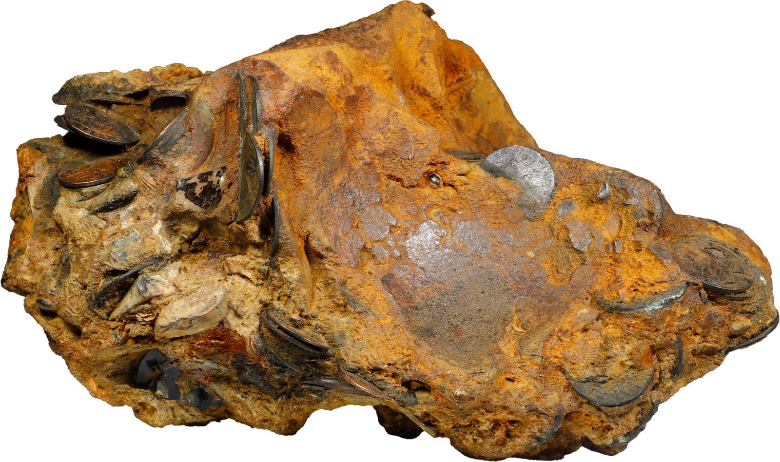 KM-139. 12.6 lb total. Roughly 9" x 7" x 5-½". A truly incredible and massive shipwreck clump that is a sight to behold, with numerous East India Company X cash coins scattered about its surfaces, many of which are darkened but with clear dates and design details visible. Even allowing for a generous 50/50 mix of coins versus other material, there are easily 450+ coins inside this clump. It appears to have been well preserved due to clustering around two iron cannonballs, whose curved impressions are quite evident. Additionally, the rusty orange matrix shows a portion of the wooden cask that the coins were stored in, as well as shards of glass here and there. Very impressive and certainly a trophy piece from this shipwreck.