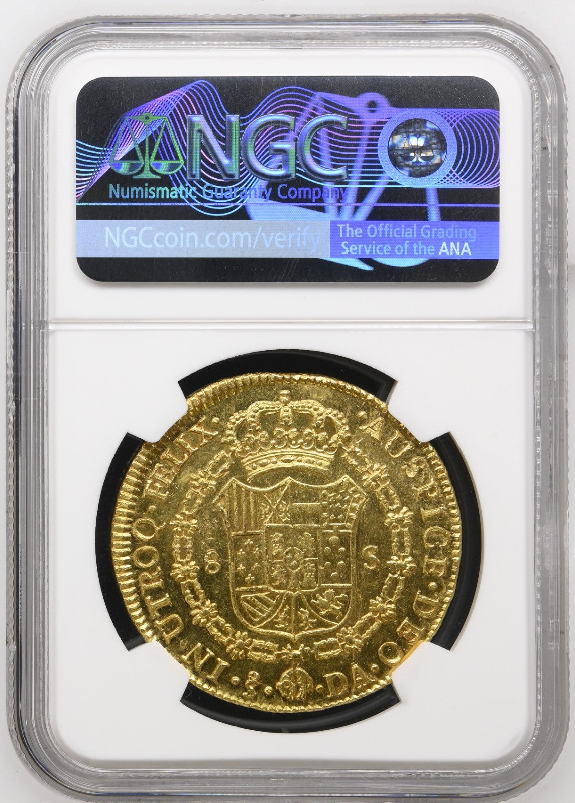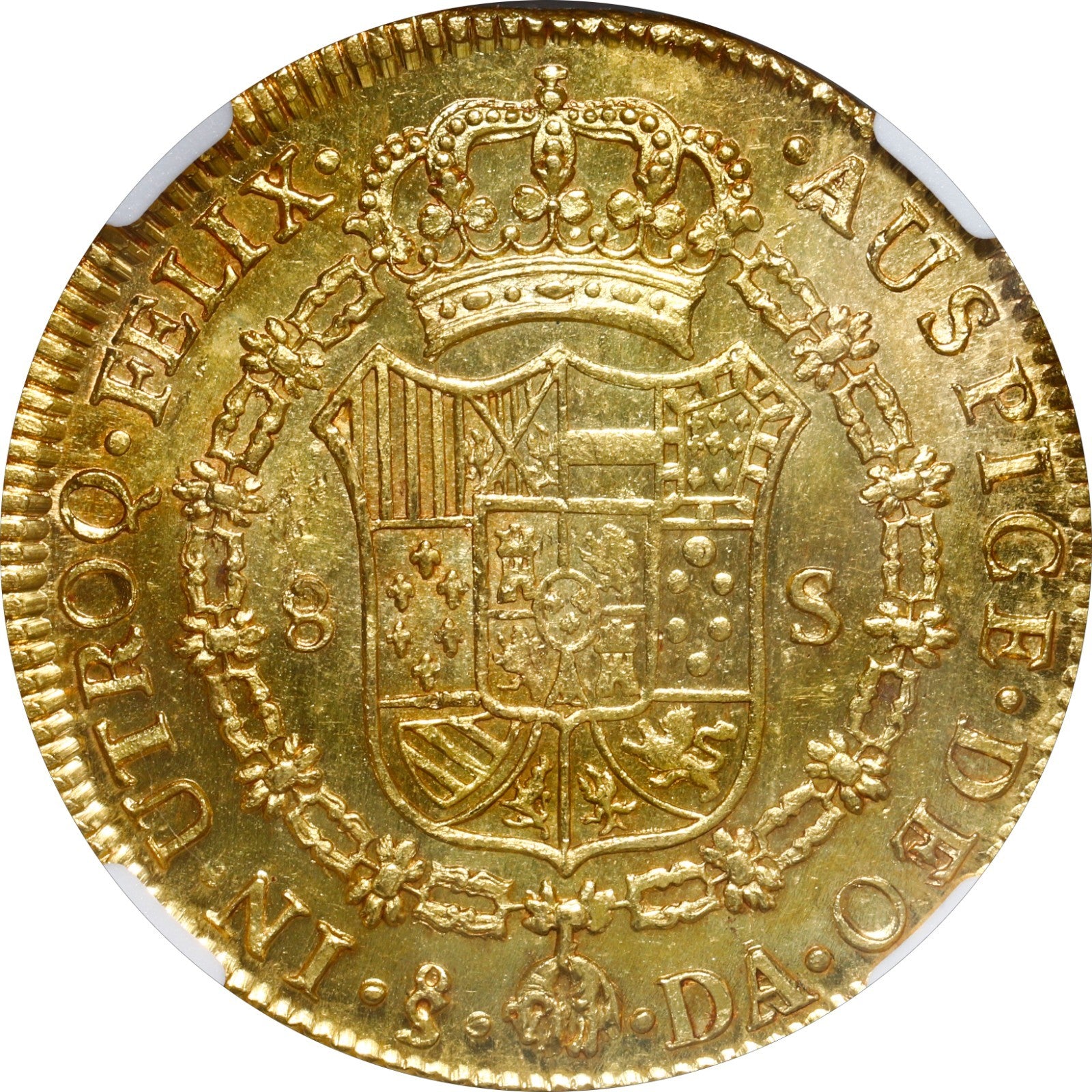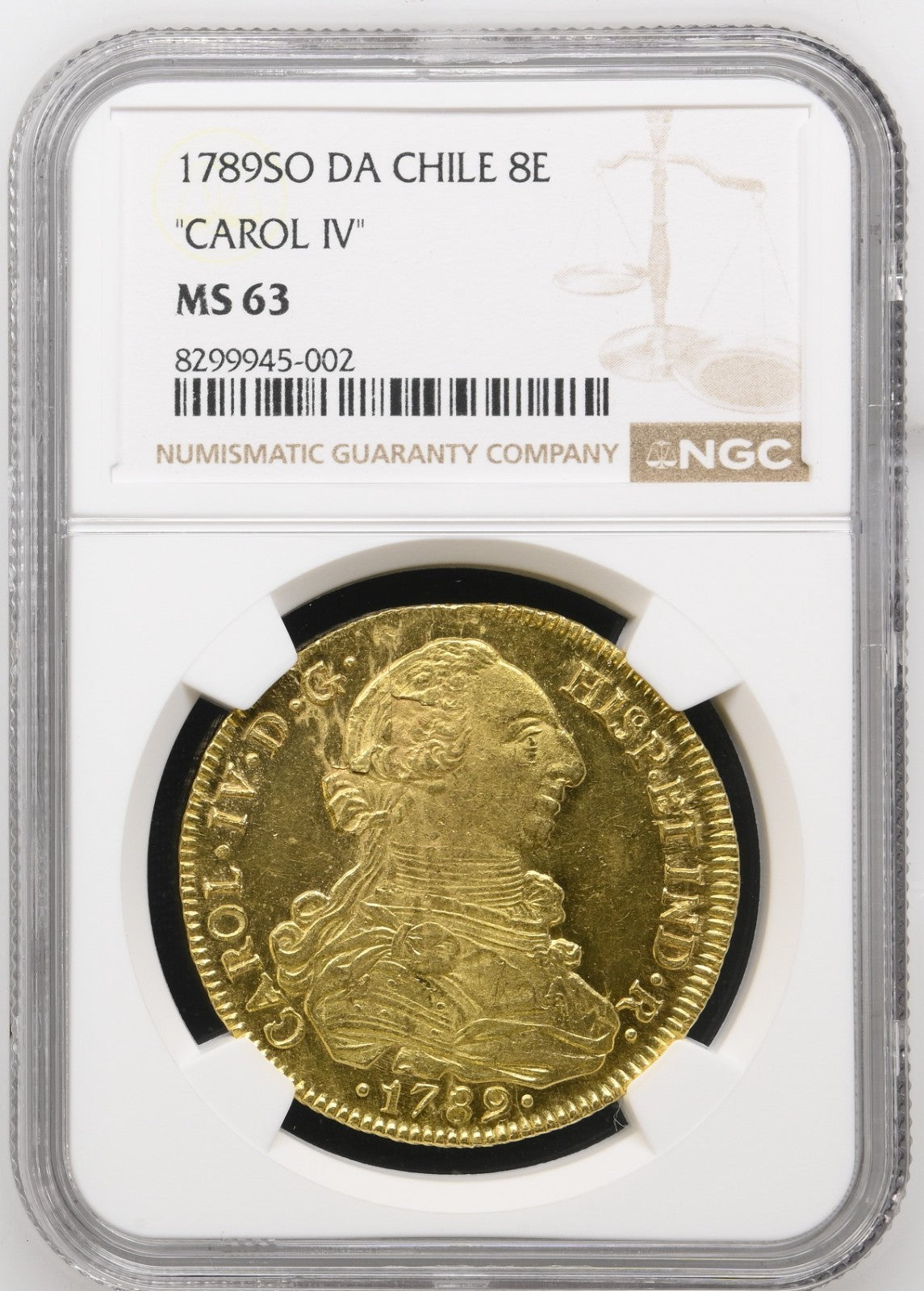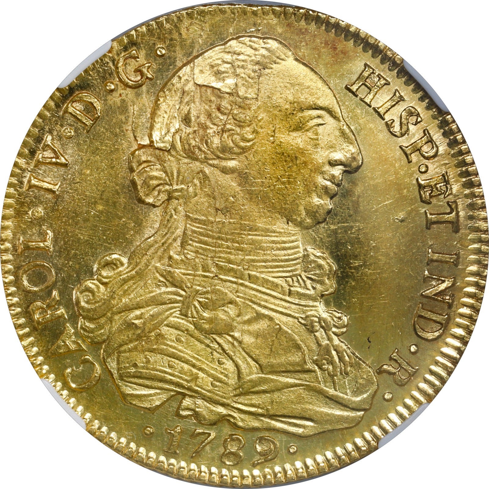 CHILE, Santiago, gold bust 8 escudos, Charles IV transitional (bust of Charles III, ordinal IV), 1789 DA, NGC MS 63, finest known in NGC census.
