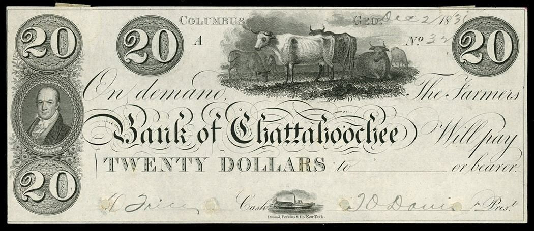Columbus, Georgia, Farmer's Bank of Chattahoochee, $20 proof, no date (1830s), pp A, rare.