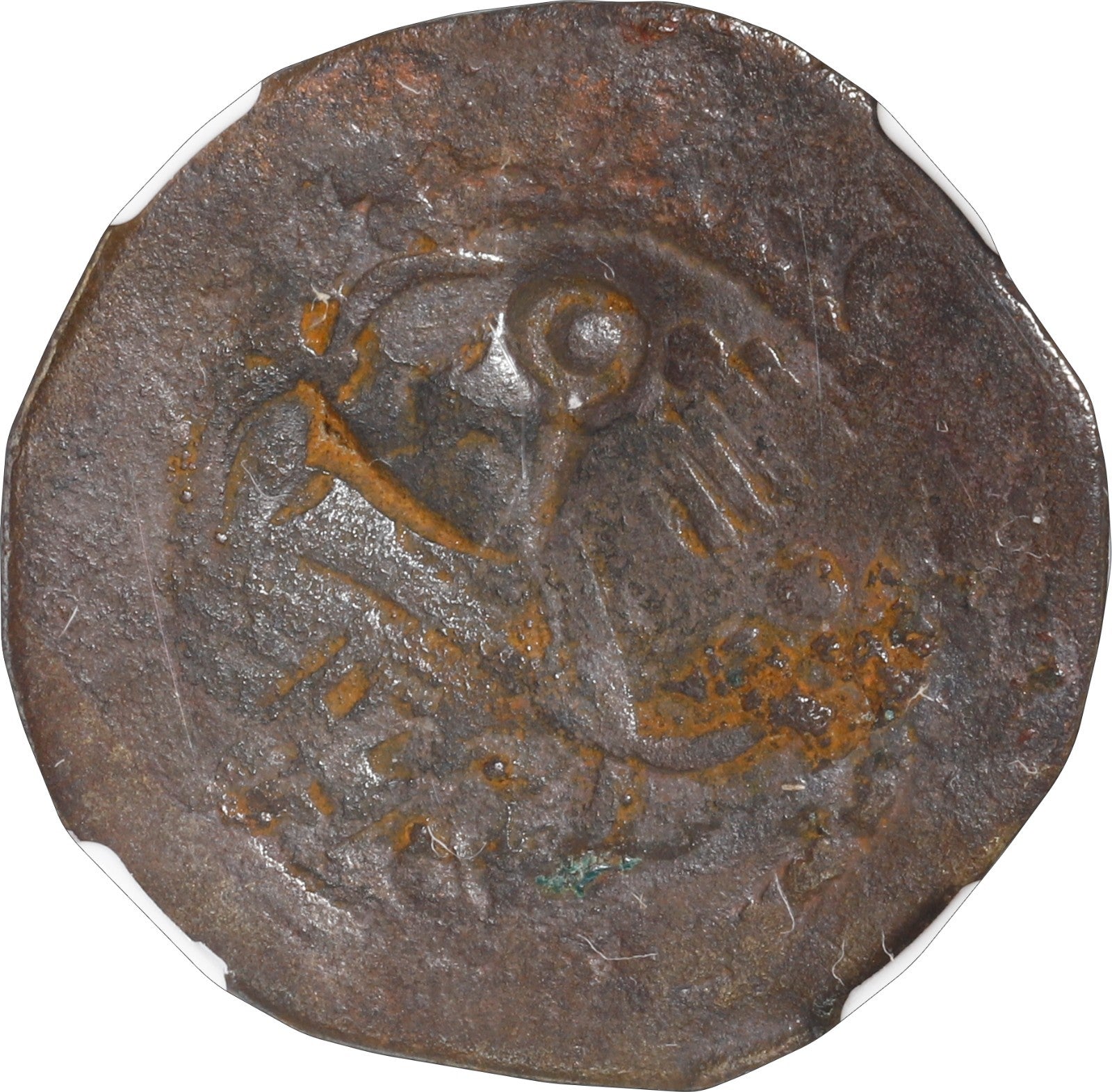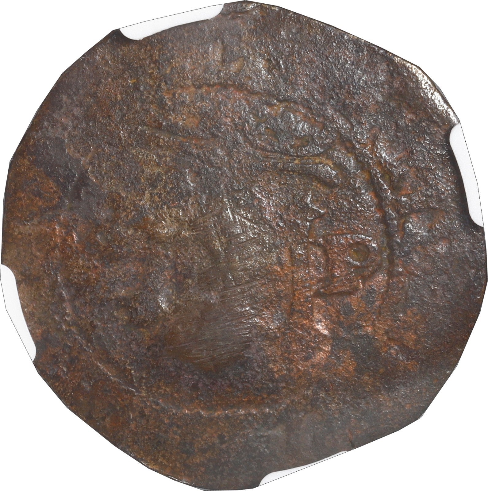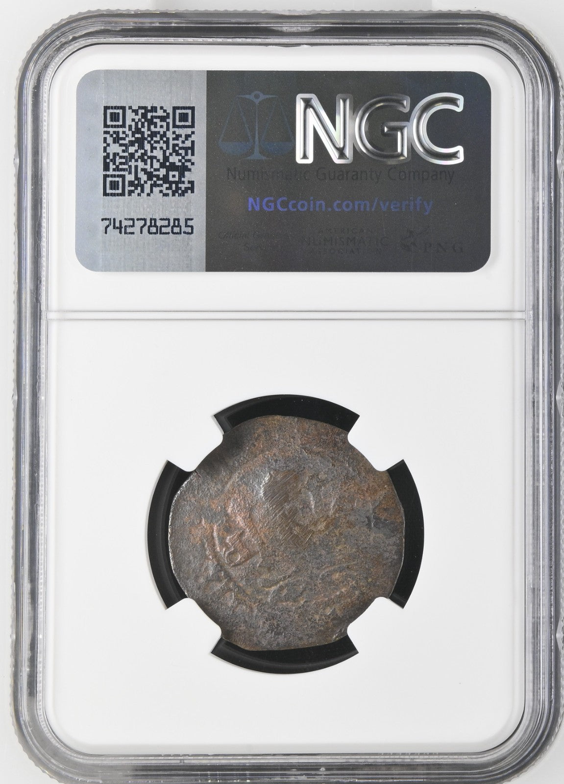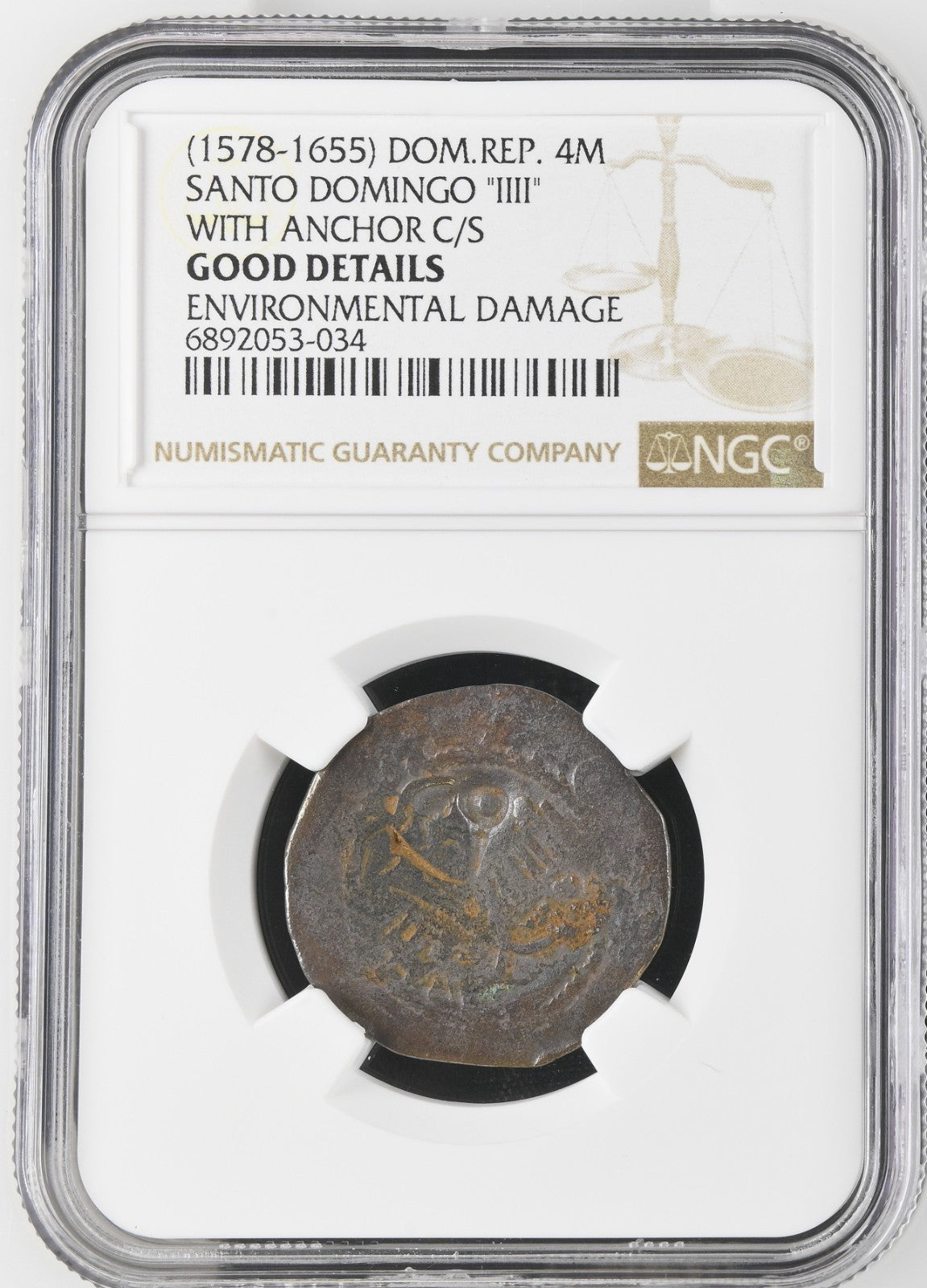 DOMINICAN REPUBLIC, Santo Domingo, copper 4 maravedís, Charles-Joanna, assayer F, denomination IIII, with anchor countermark (Jamaica, 1/7 real, 1611-1616), NGC VG details / environmental damage.