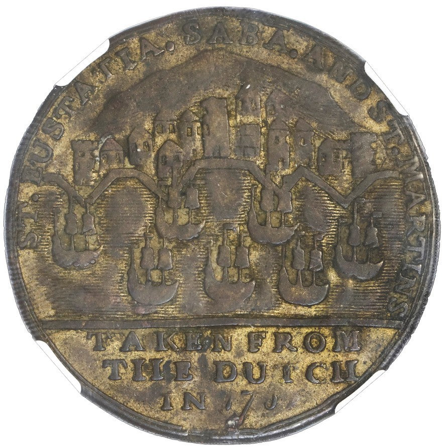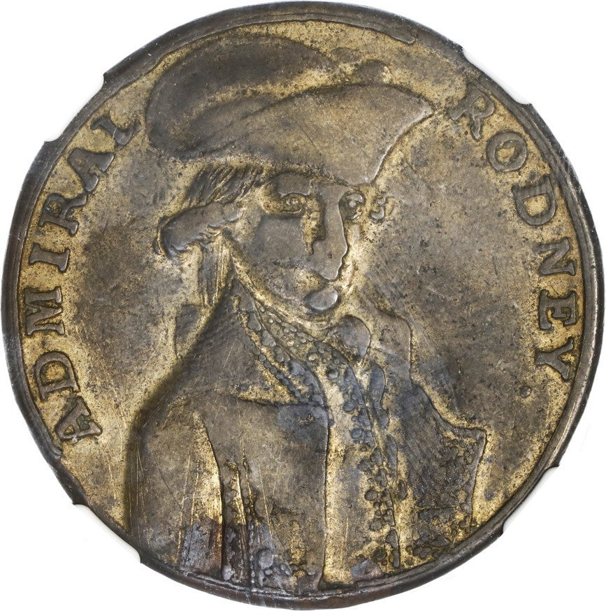 BHM-235. 35 mm. Popular larger-size medal commemorating Admiral Rodney's capture of Saint Eustatius from the Dutch and munitions meant for George Washington's army. Fairly worn but detailed with some brassy luster around the design. (NGC #6097547-015)
