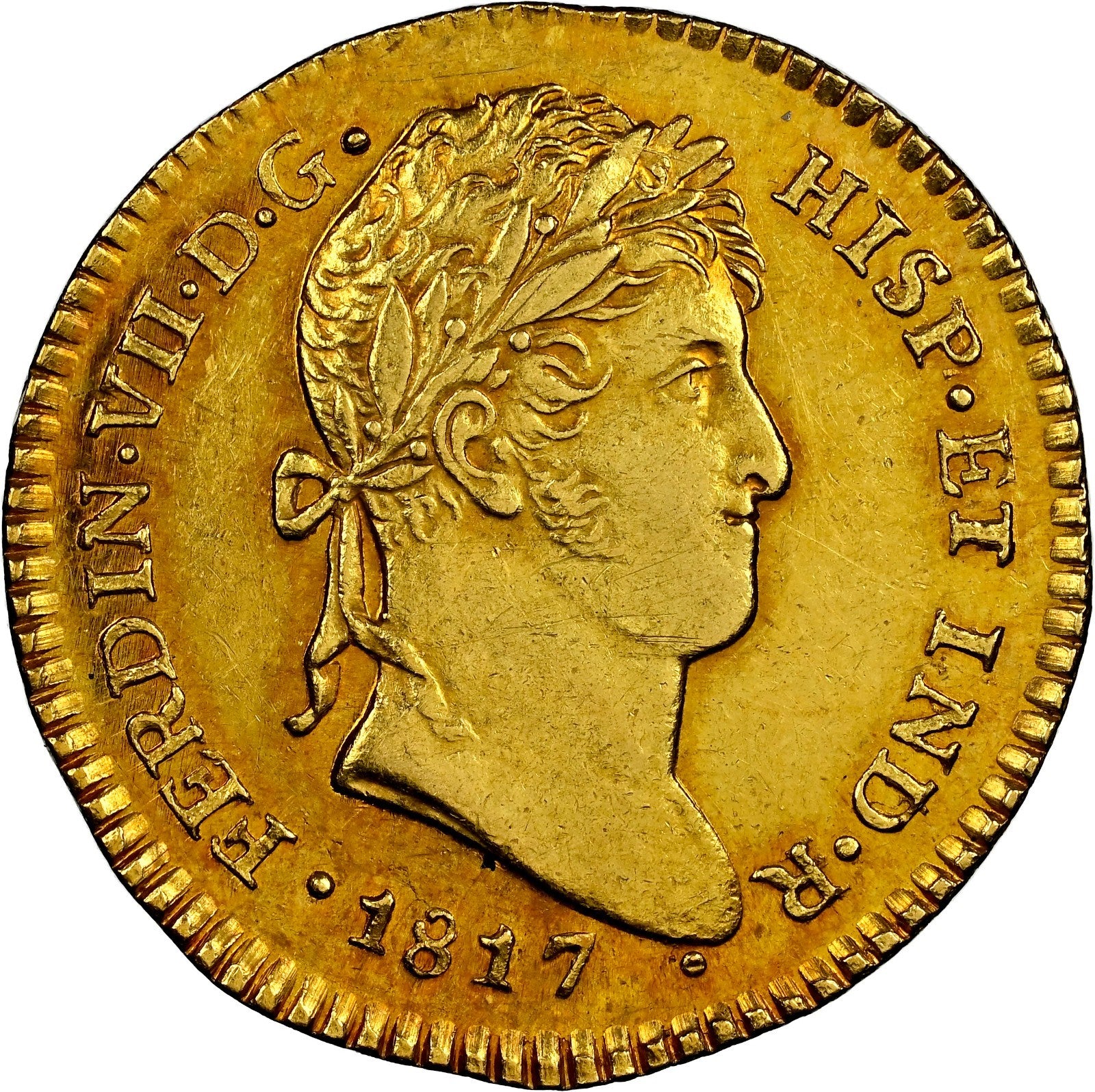 GUATEMALA, Guatemala City, gold bust 2 escudos, Ferdinand VII, 1817 M, NGC AU 58, ex-Rudman.