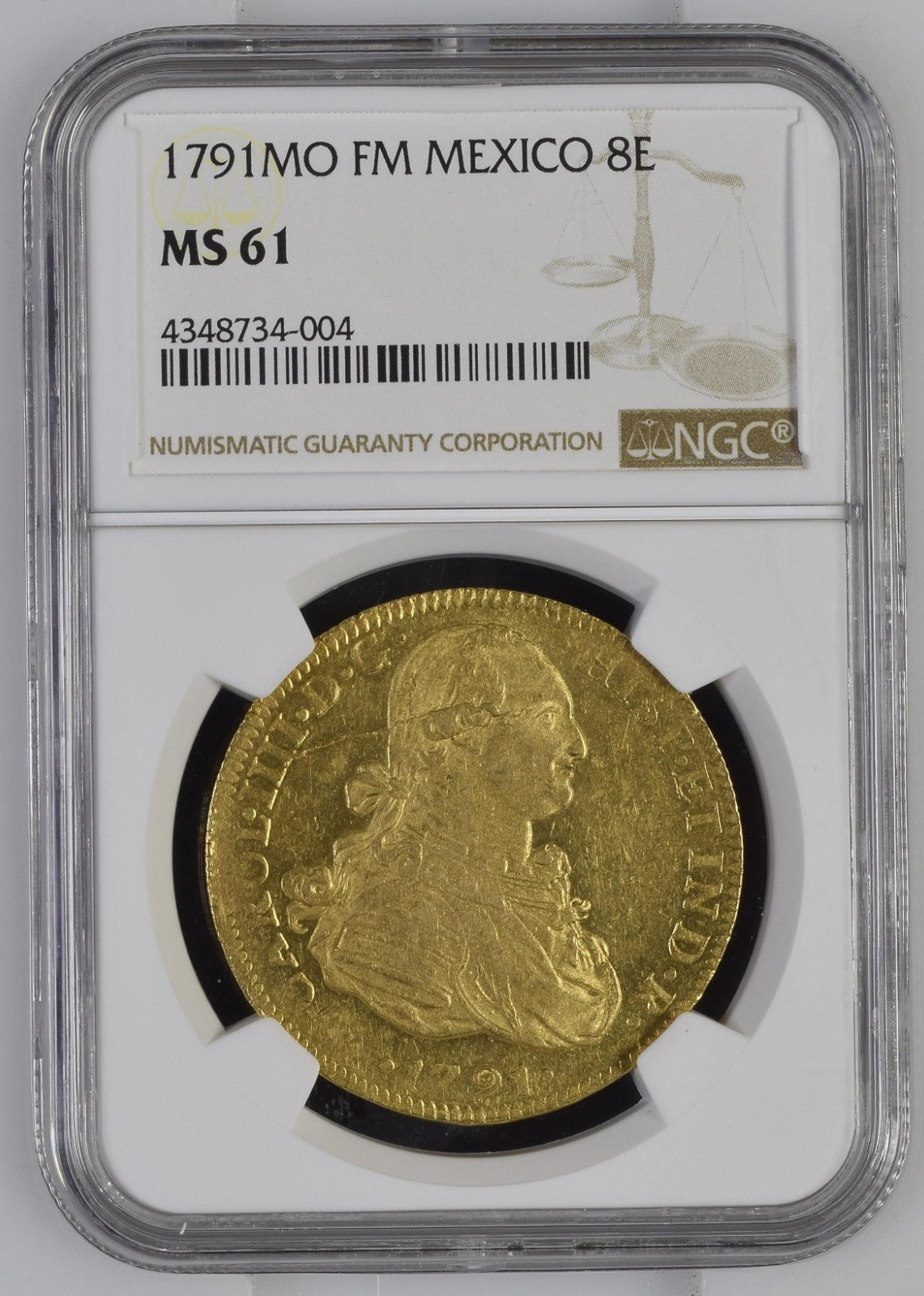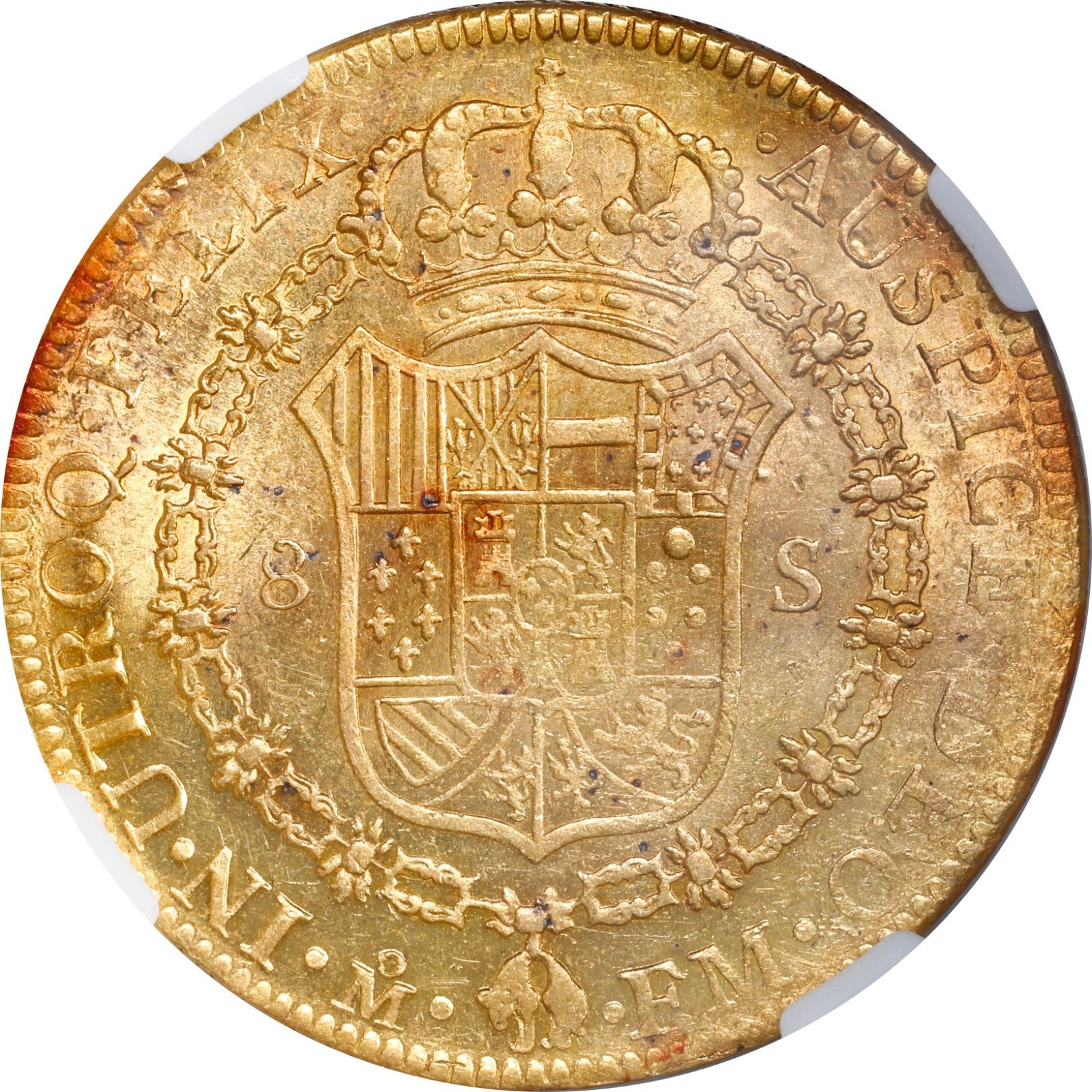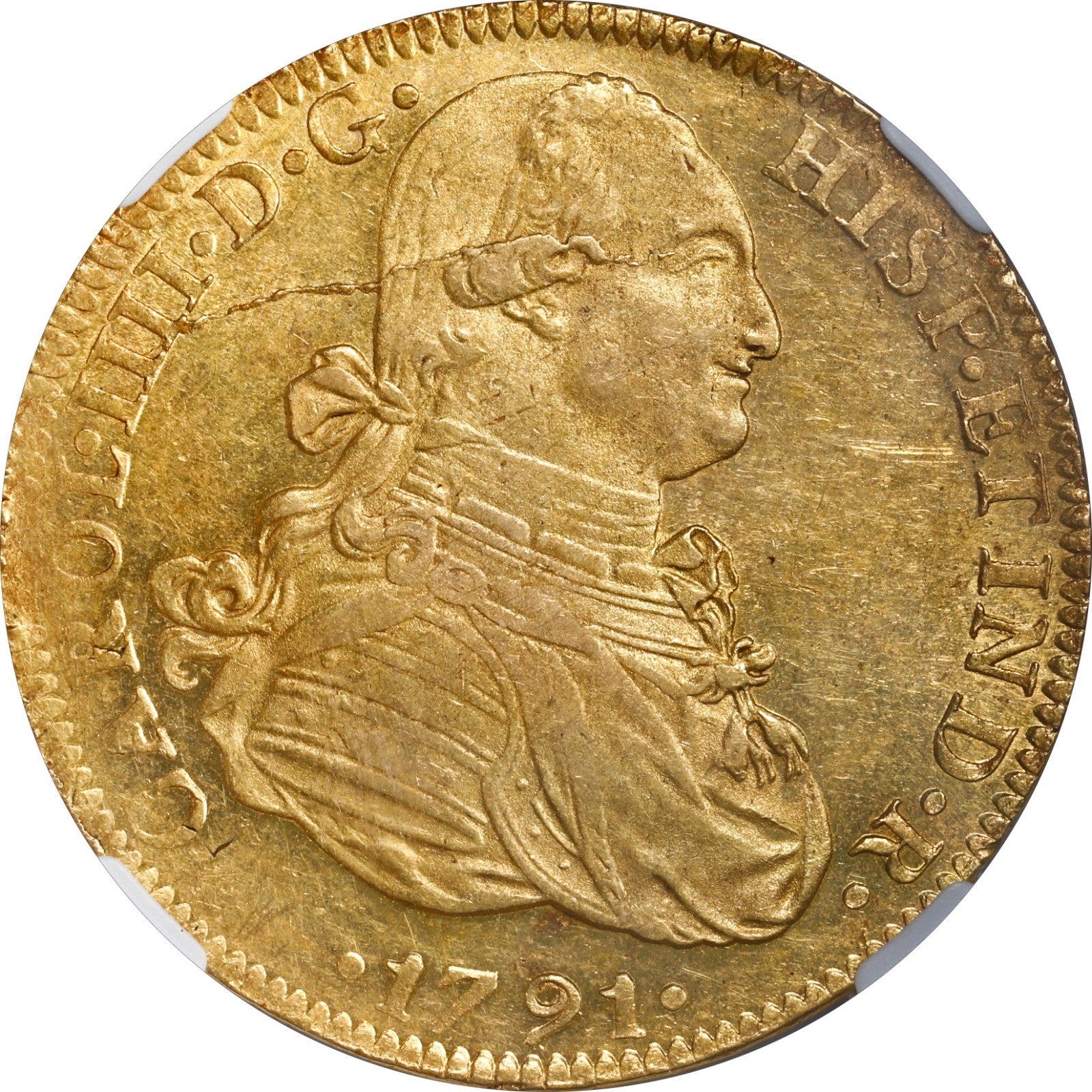 MEXICO, Mexico City, gold bust 8 escudos, Charles IV, 1791 FM, NGC MS 61.