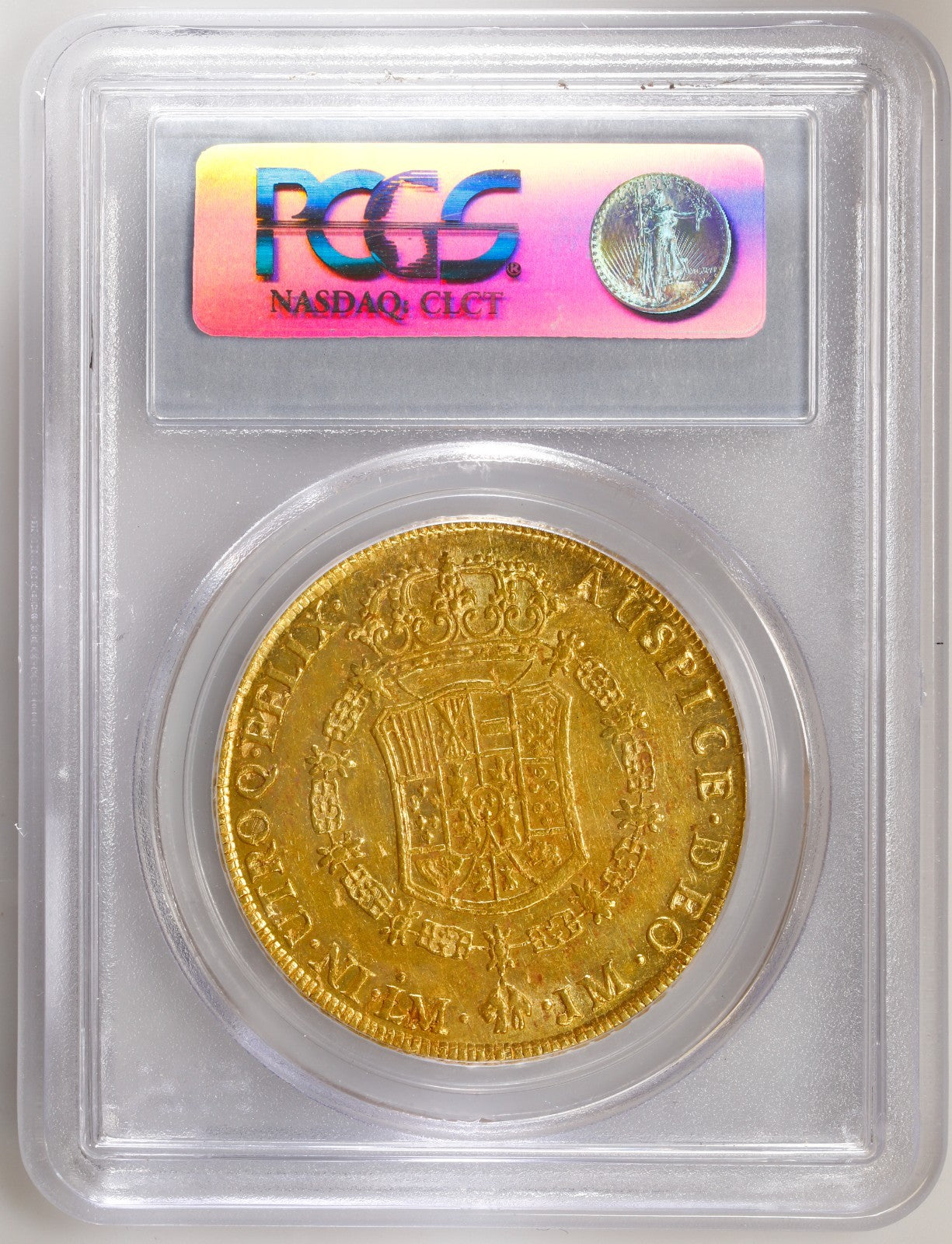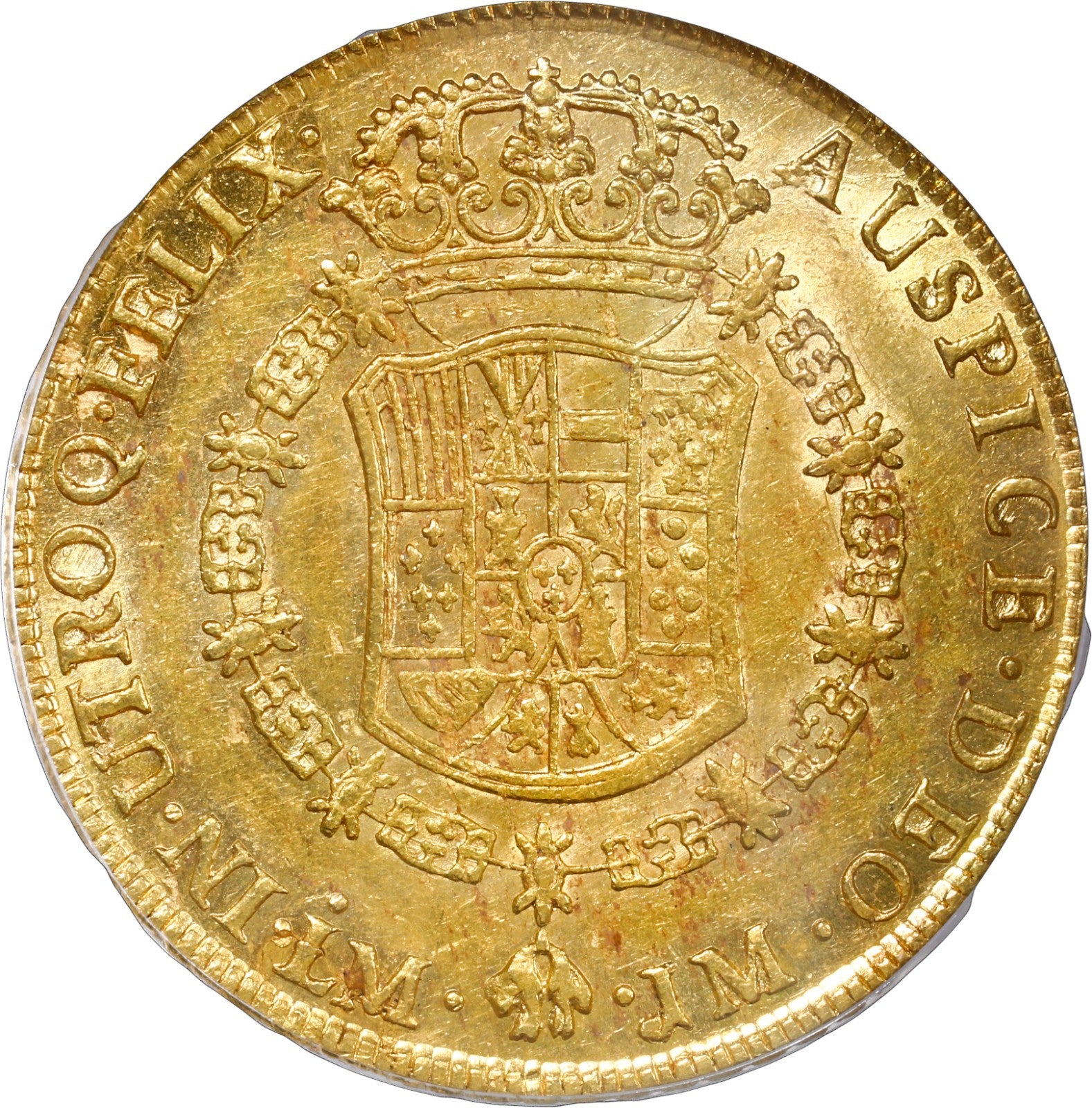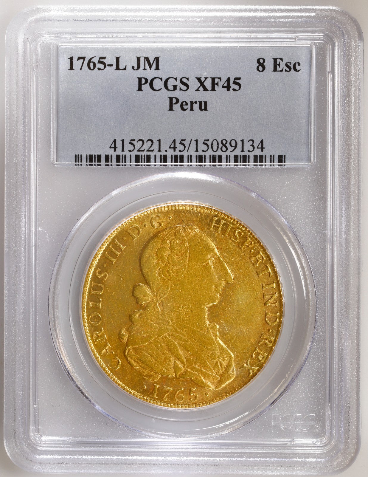 PERU, Lima, gold 8 escudos, Charles III, 1765 JM, "rat nose" bust, rare, PCGS AU55, finest known in PCGS census.