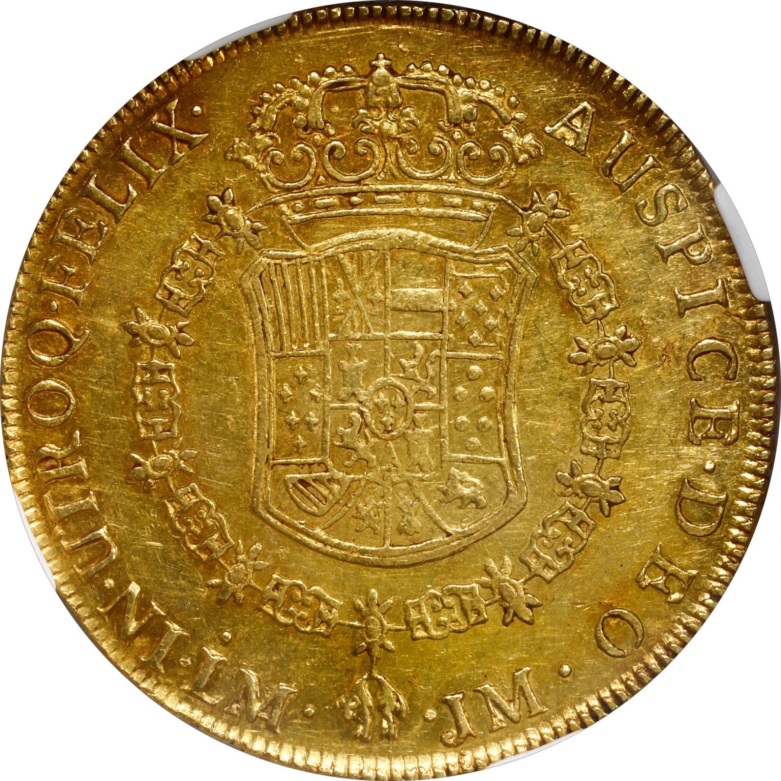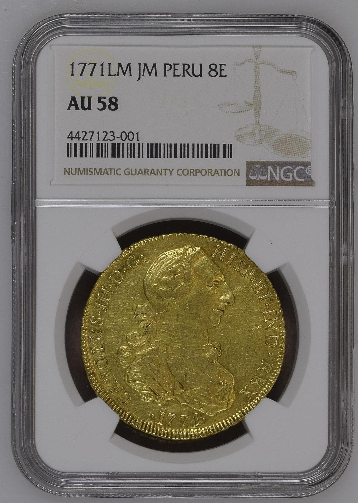 PERU, Lima, gold bust 8 escudos, Charles III, 1771 JM, third bust, very rare, NGC AU 58.