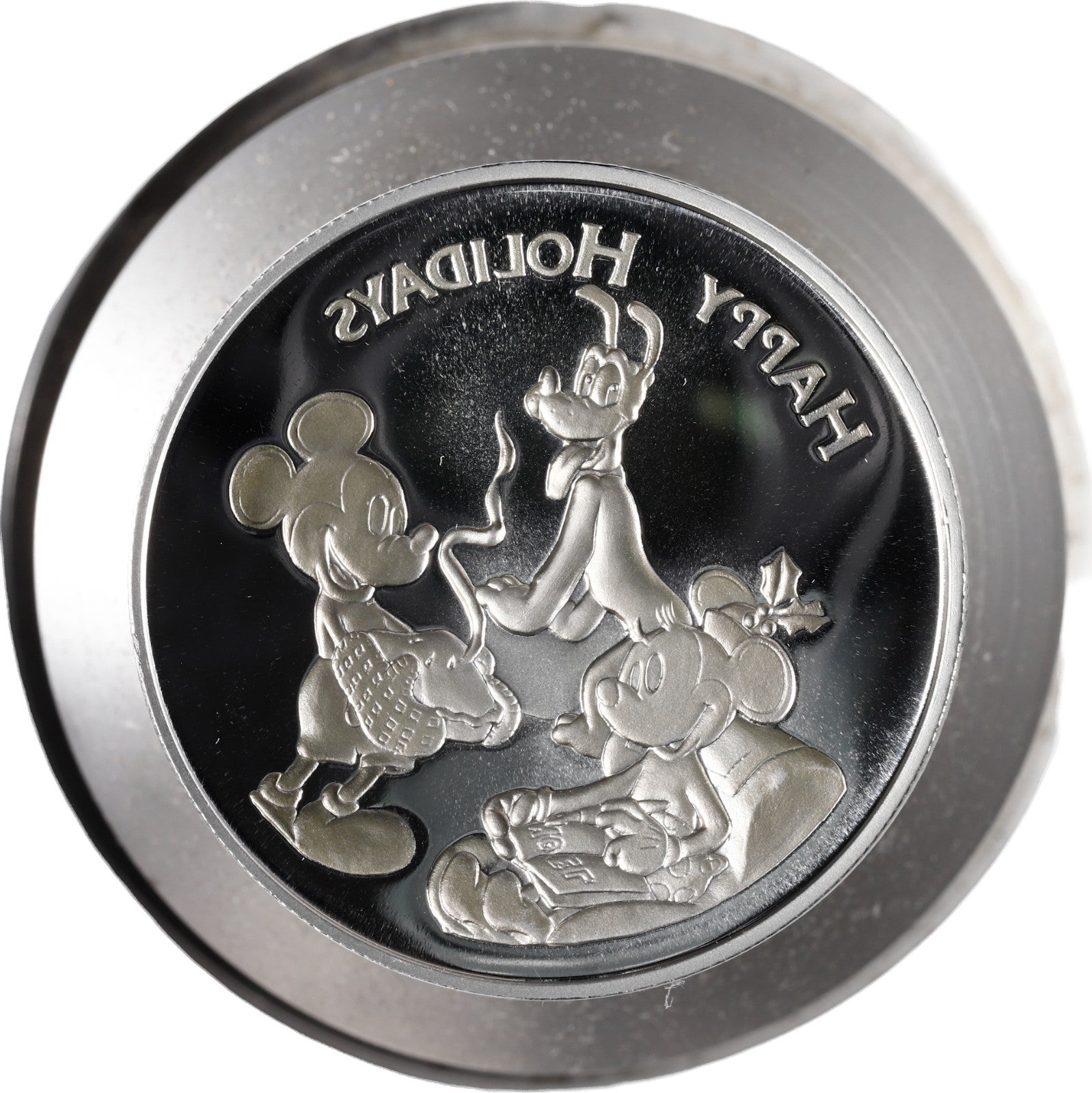 Heavy polished steel striking die with mirrored design of classic Disney characters Mickey Mouse, Minnie Mouse, and Pluto, with the legend HAPPY HOLIDAYS around. Professional industrial engraving of high quality, intended for official medallic production. The die face shows strong reflective polish with crisp recessed details, normal light handling marks only, and no cancellation, grinding, or defacement of any kind.