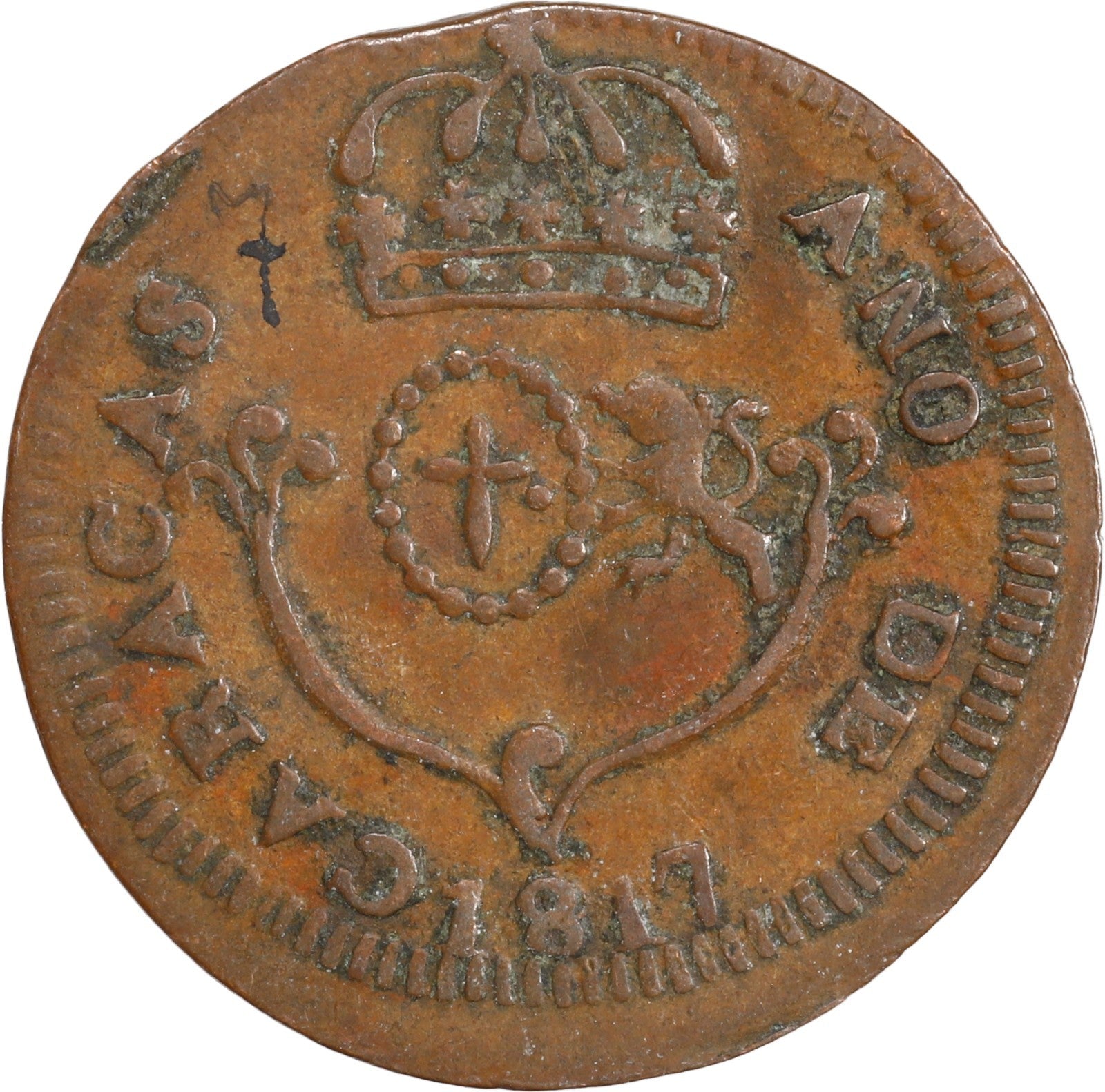 VENEZUELA, Caracas, copper ¼ real, Ferdinand VII, 1817, small date.