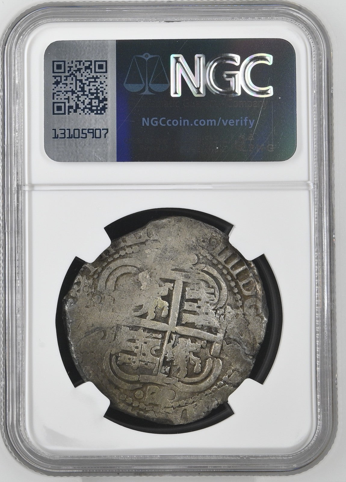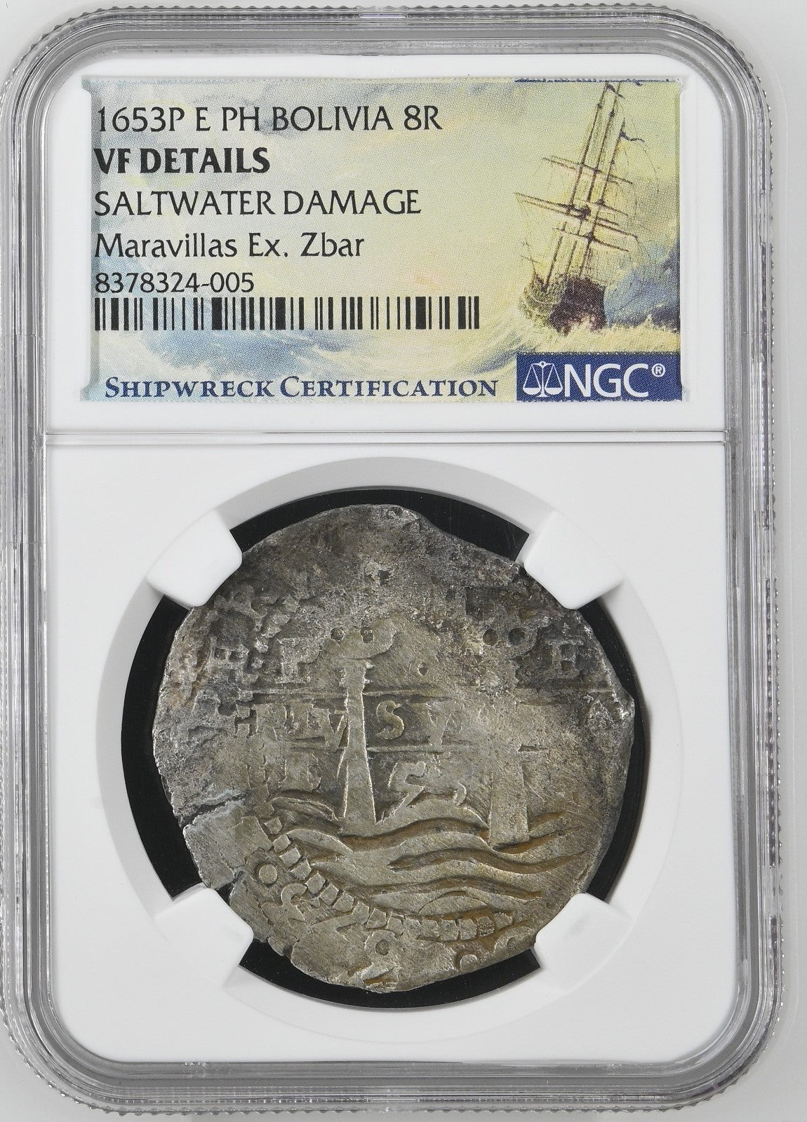 BOLIVIA, Potosí, cob 8 reales, 1653 E, PH at top, •pomegranate• above cross, NGC VF details / saltwater damage (Shipwreck Blue Label), ex-Zbar.