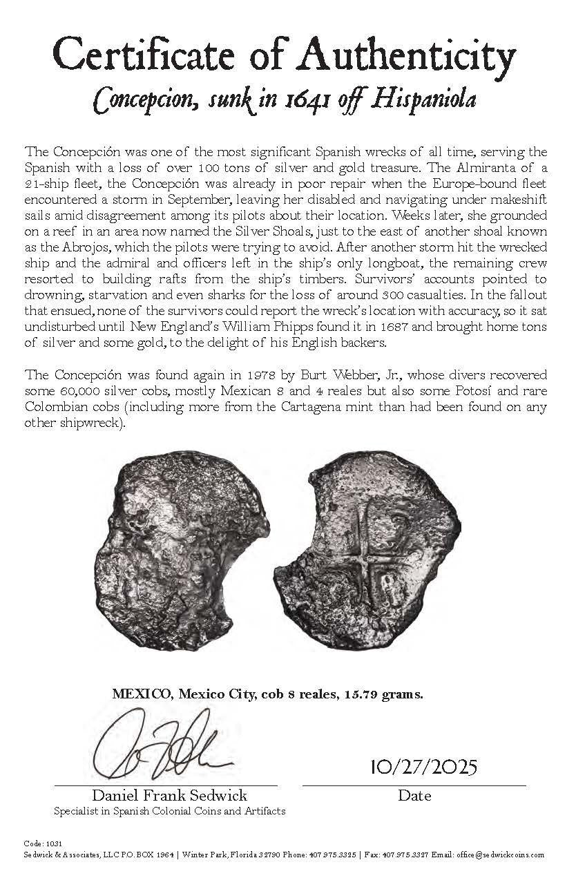 Concepcion Shipwreck (1641) MEXICO Mexico City Silver Cob 8 Reales with COA 1031