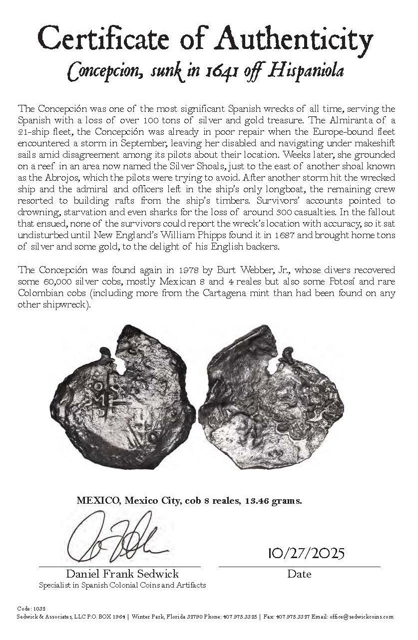 Concepcion Shipwreck (1641) MEXICO Mexico City Silver Cob 8 Reales with COA 1032