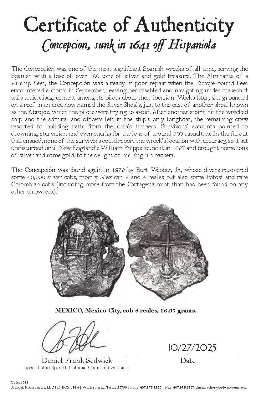 Concepcion Shipwreck (1641) MEXICO Mexico City Silver Cob 8 Reales with COA 1033
