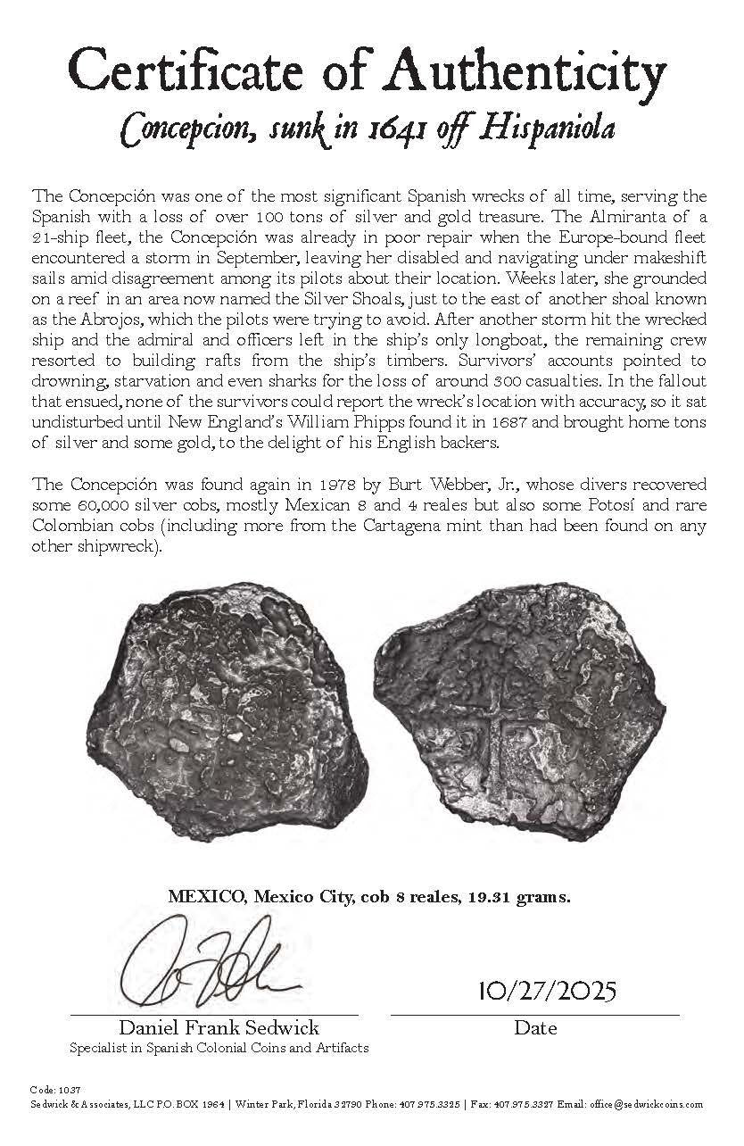 Concepcion Shipwreck (1641) MEXICO Mexico City Silver Cob 8 Reales with COA 1037