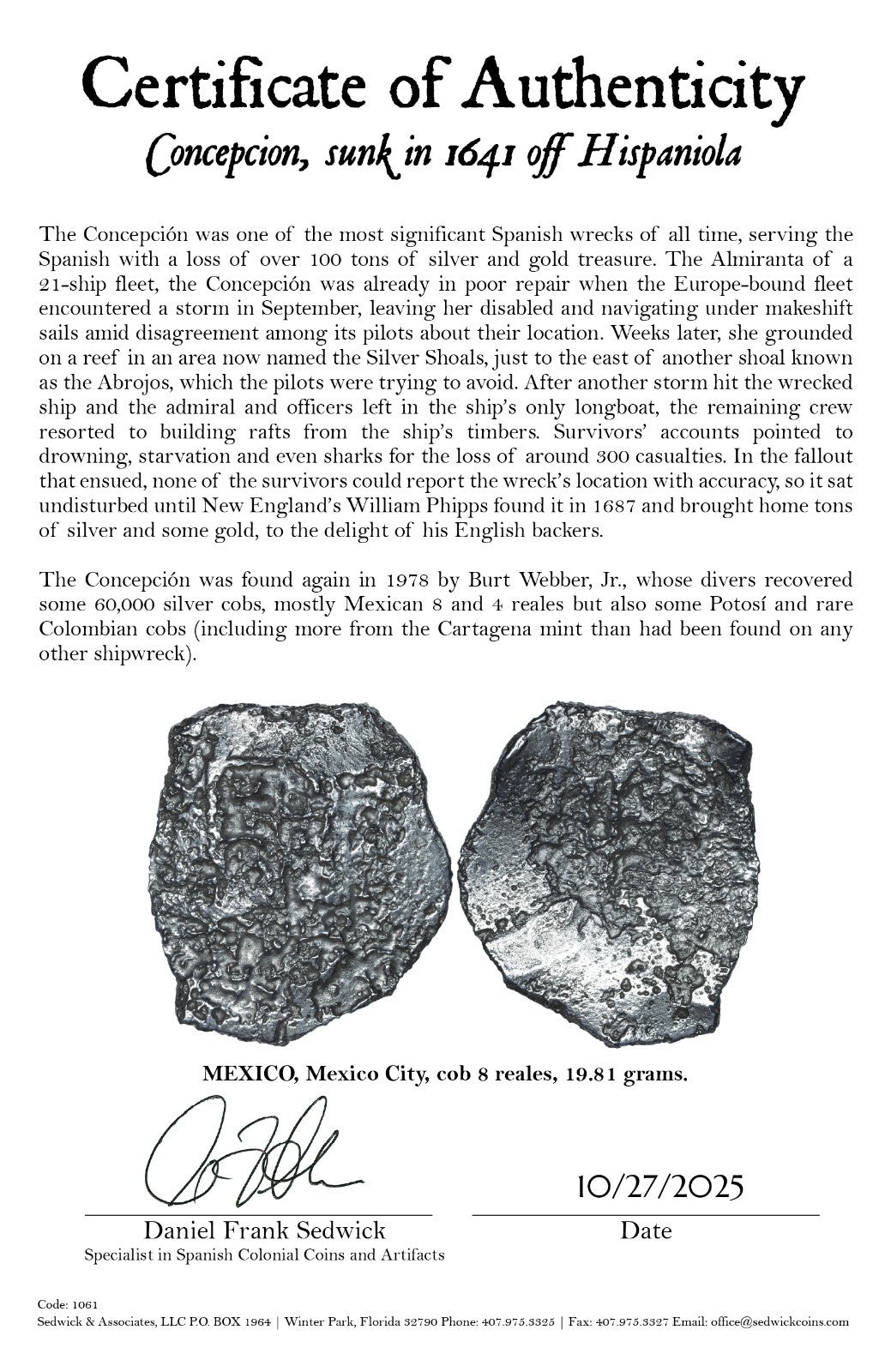 Concepcion Shipwreck (1641) MEXICO Mexico City Silver Cob 8 Reales with COA 1061