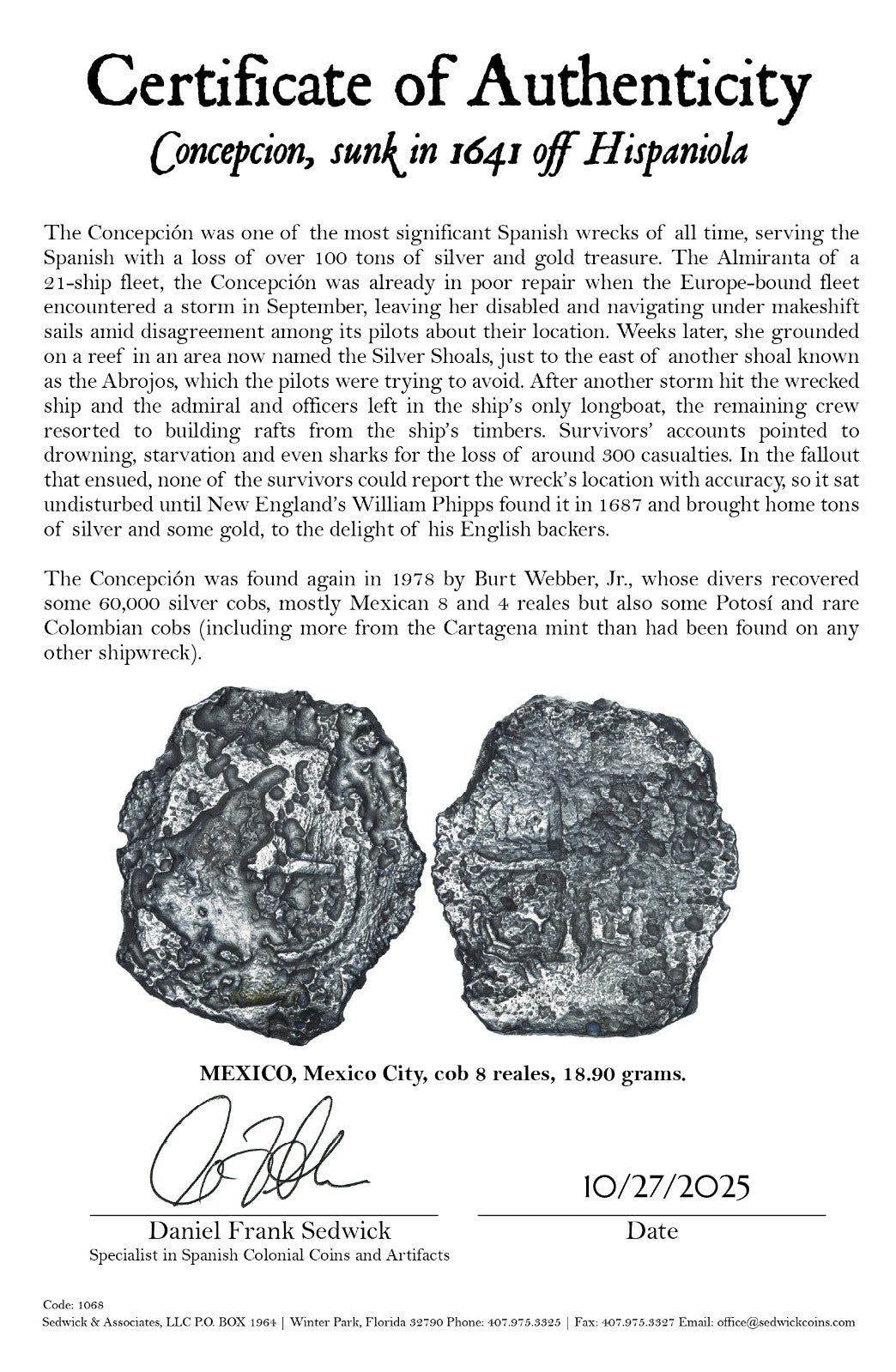 Concepcion Shipwreck (1641) MEXICO Mexico City Silver Cob 8 Reales with COA 1068