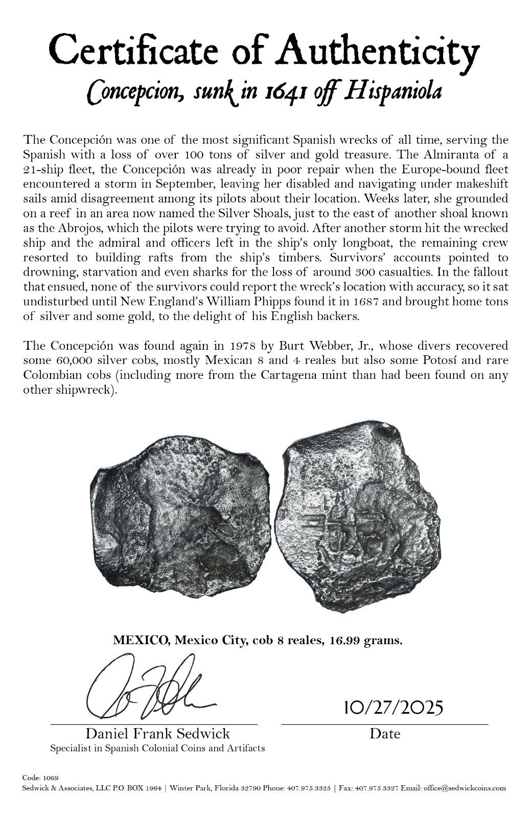 Concepcion Shipwreck (1641) MEXICO Mexico City Silver Cob 8 Reales with COA 1069