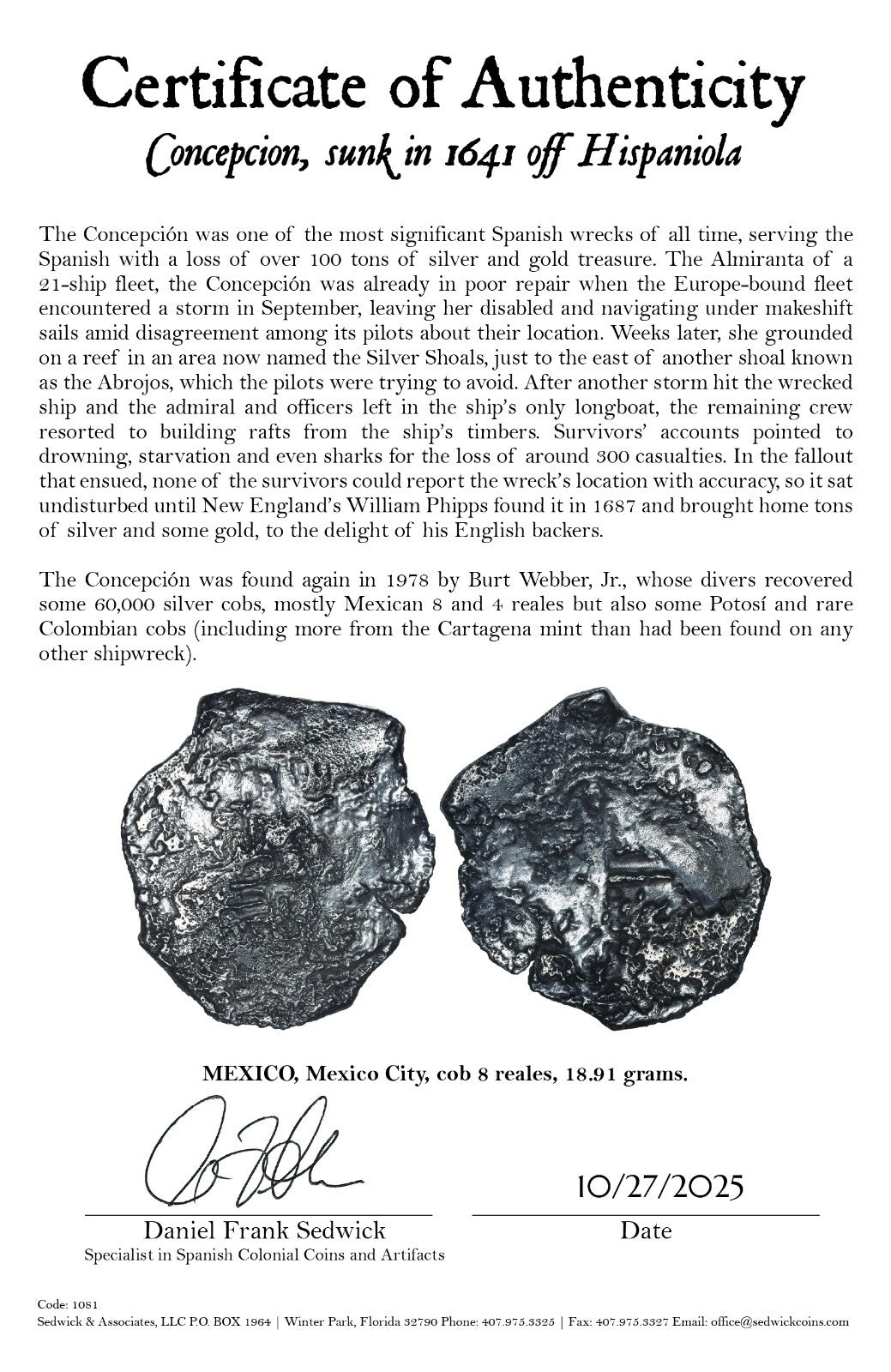 Concepcion Shipwreck (1641) MEXICO Mexico City Silver Cob 8 Reales with COA 1081