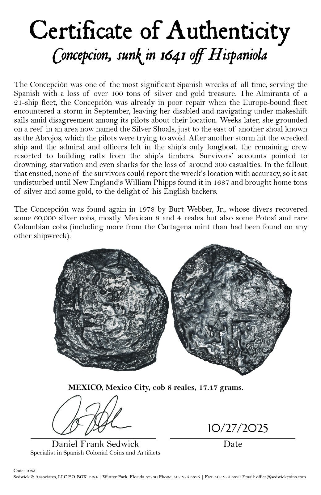 Concepcion Shipwreck (1641) MEXICO Mexico City Silver Cob 8 Reales with COA 1085