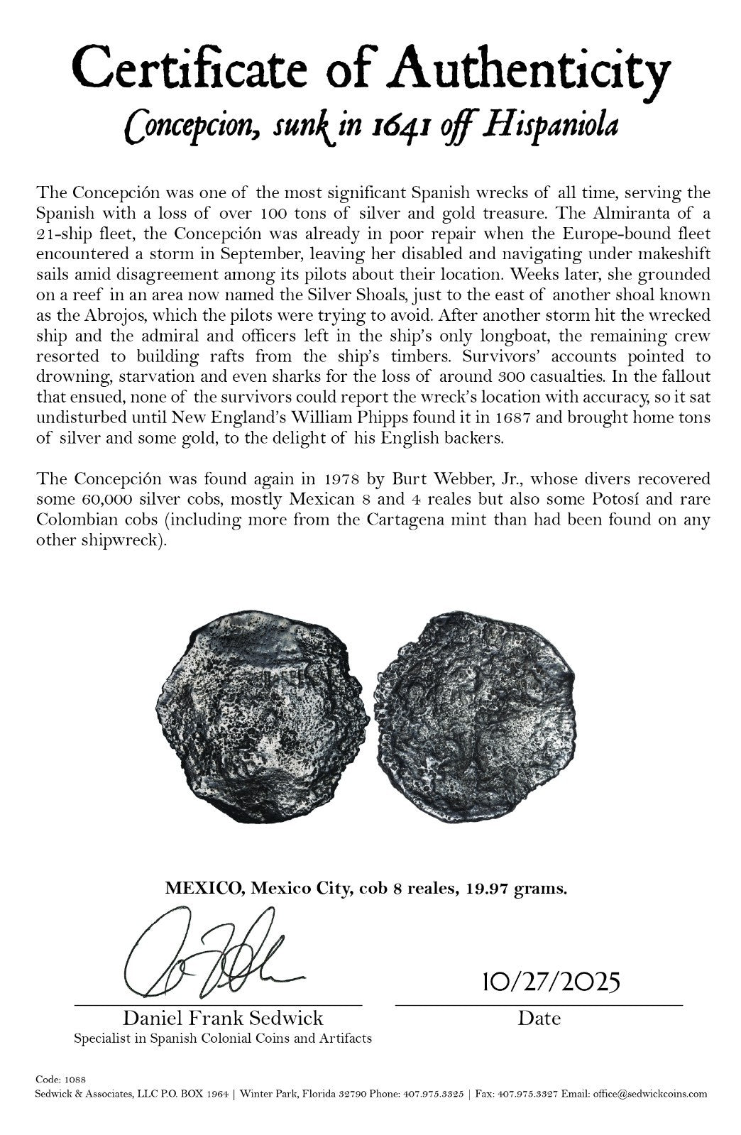 Concepcion Shipwreck (1641) MEXICO Mexico City Silver Cob 8 Reales with COA 1088