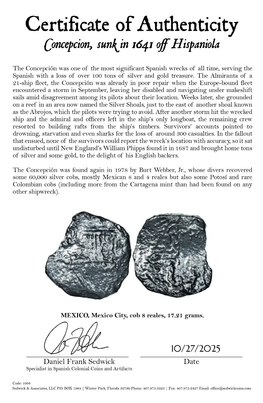 Concepcion Shipwreck (1641) MEXICO Mexico City Silver Cob 8 Reales with COA 1098