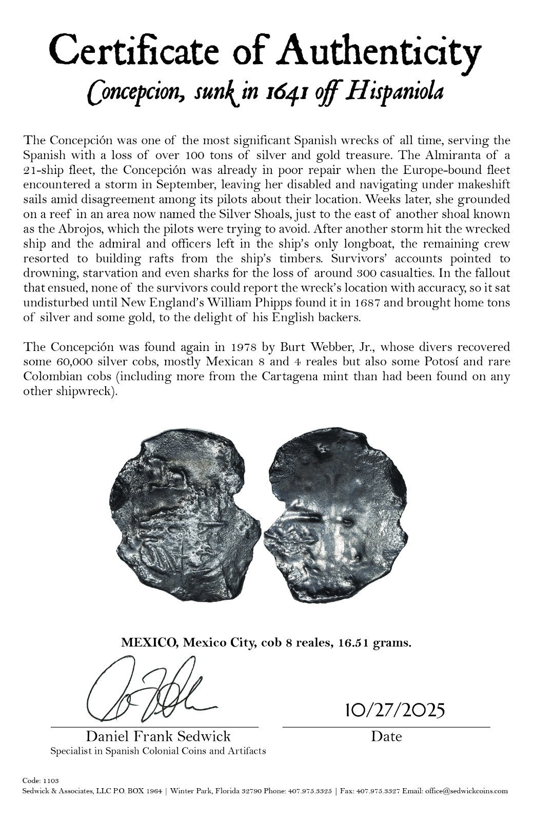Concepcion Shipwreck (1641) MEXICO Mexico City Silver Cob 8 Reales with COA 1103
