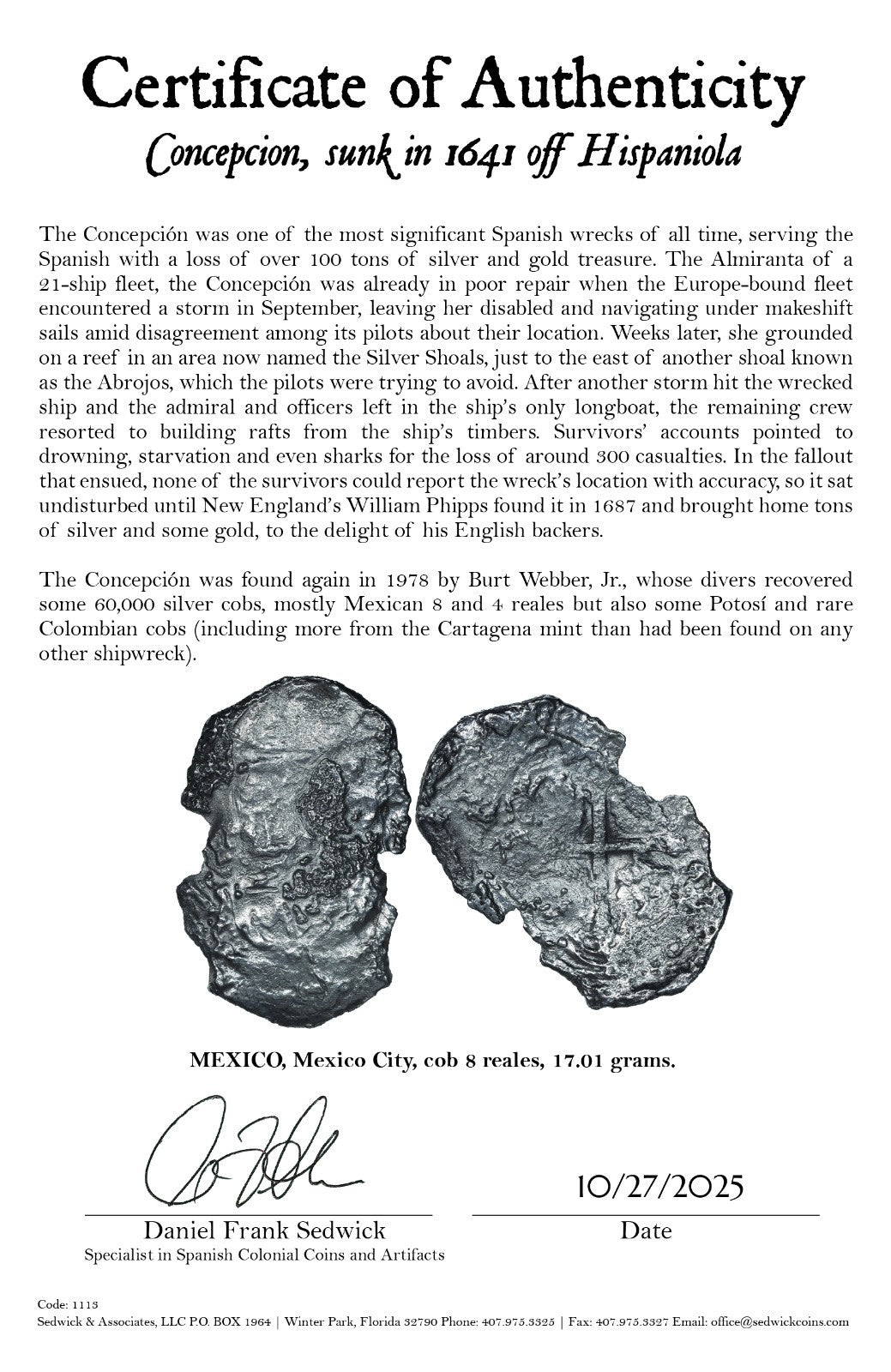 Concepcion Shipwreck (1641) MEXICO Mexico City Silver Cob 8 Reales with COA 1113