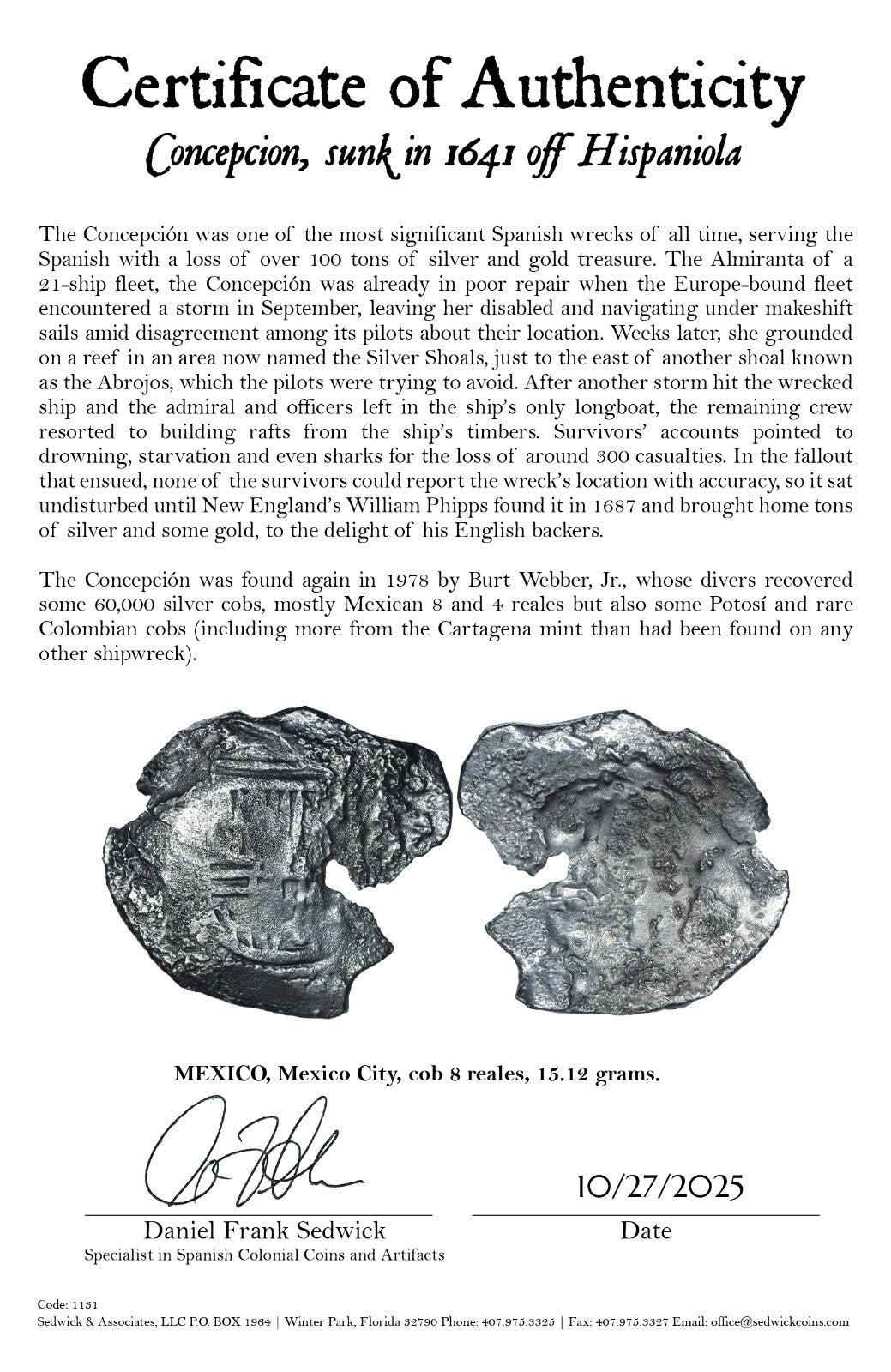 Concepcion Shipwreck (1641) MEXICO Mexico City Silver Cob 8 Reales with COA 1131