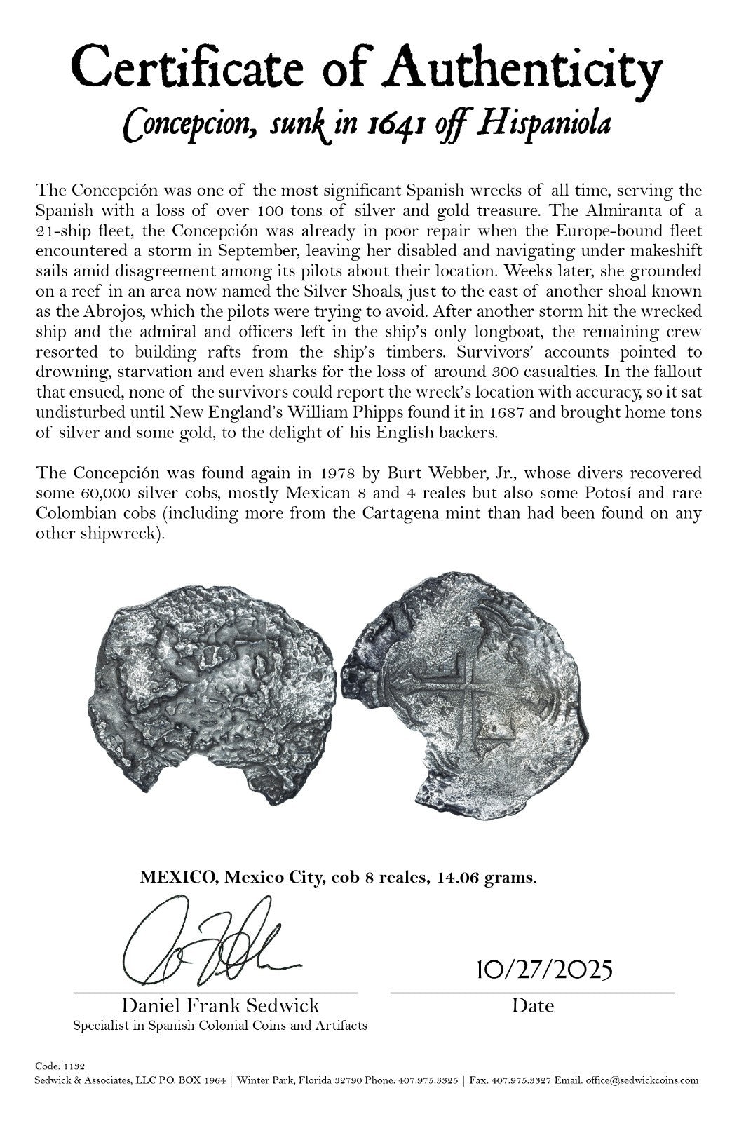 Concepcion Shipwreck (1641) MEXICO Mexico City Silver Cob 8 Reales with COA 1132