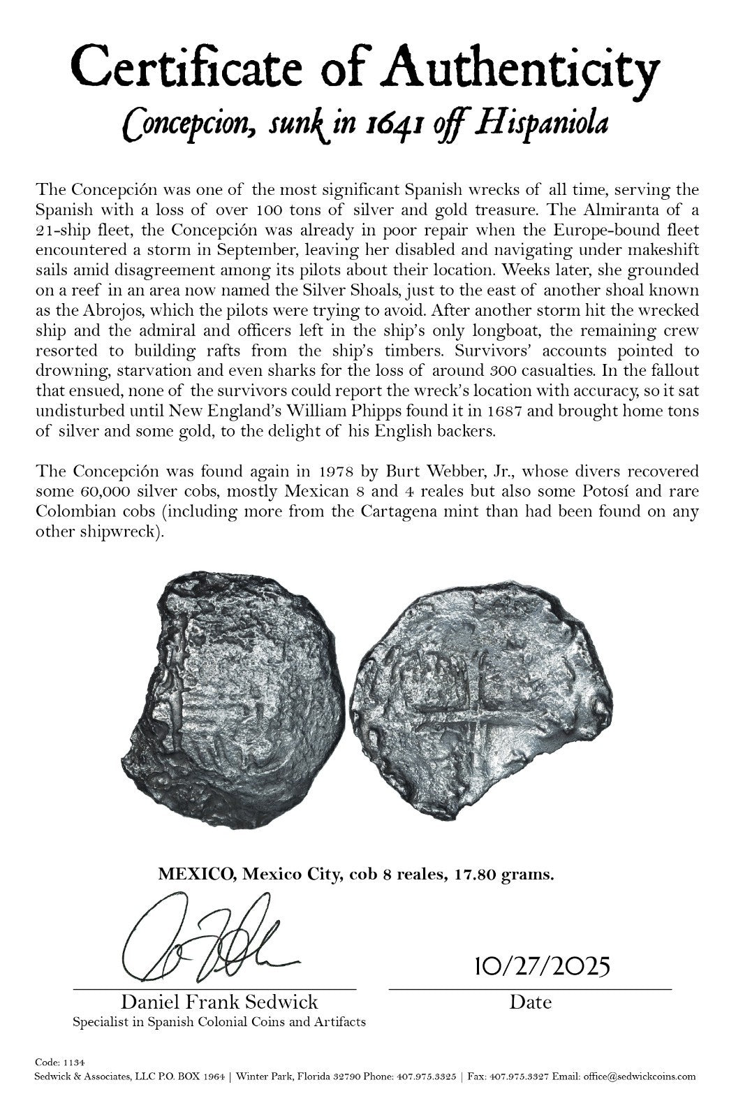 Concepcion Shipwreck (1641) MEXICO Mexico City Silver Cob 8 Reales with COA 1134
