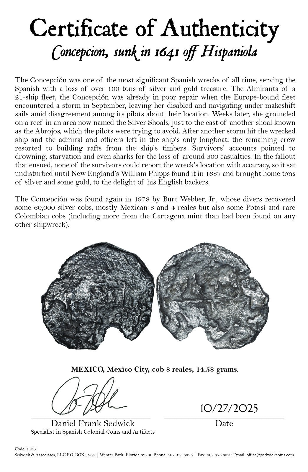 Concepcion Shipwreck (1641) MEXICO Mexico City Silver Cob 8 Reales with COA 1136