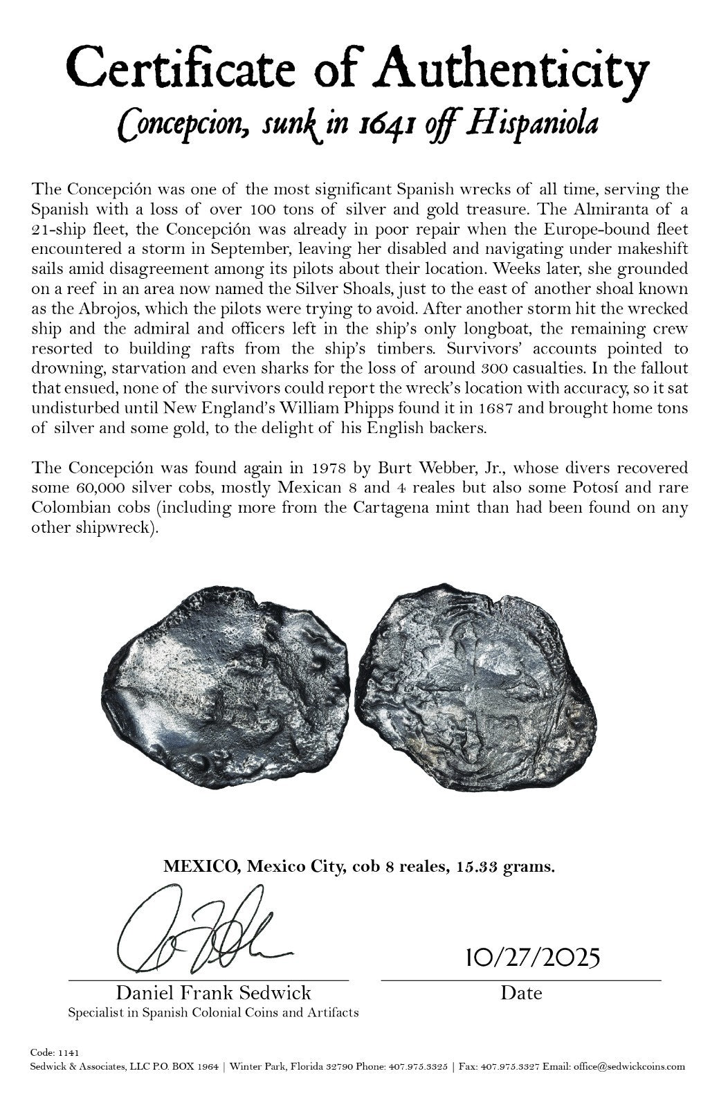 Concepcion Shipwreck (1641) MEXICO Mexico City Silver Cob 8 Reales with COA 1141