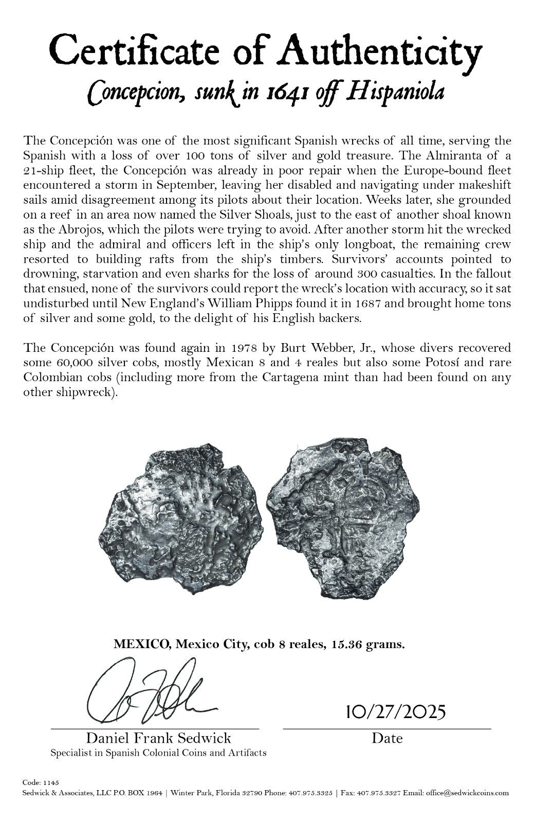 Concepcion Shipwreck (1641) MEXICO Mexico City Silver Cob 8 Reales with COA 1145