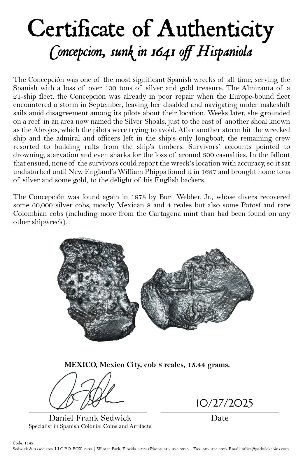 Concepcion Shipwreck (1641) MEXICO Mexico City Silver Cob 8 Reales with COA 1149