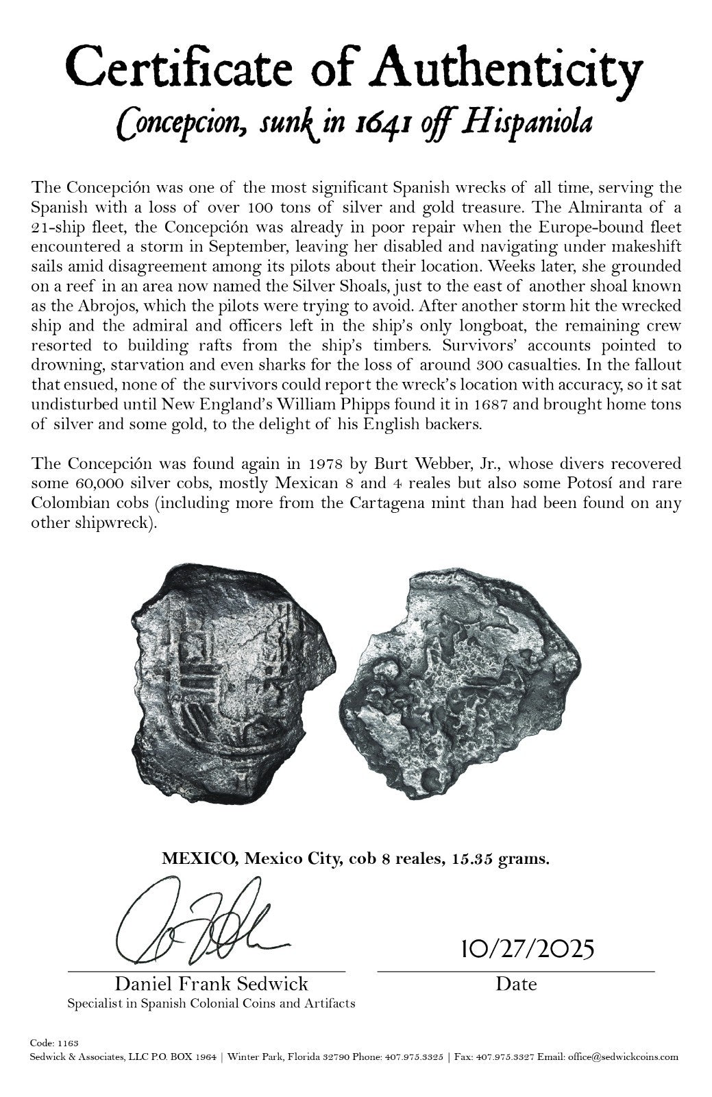 Concepcion Shipwreck (1641) MEXICO Mexico City Silver Cob 8 Reales with COA 1163