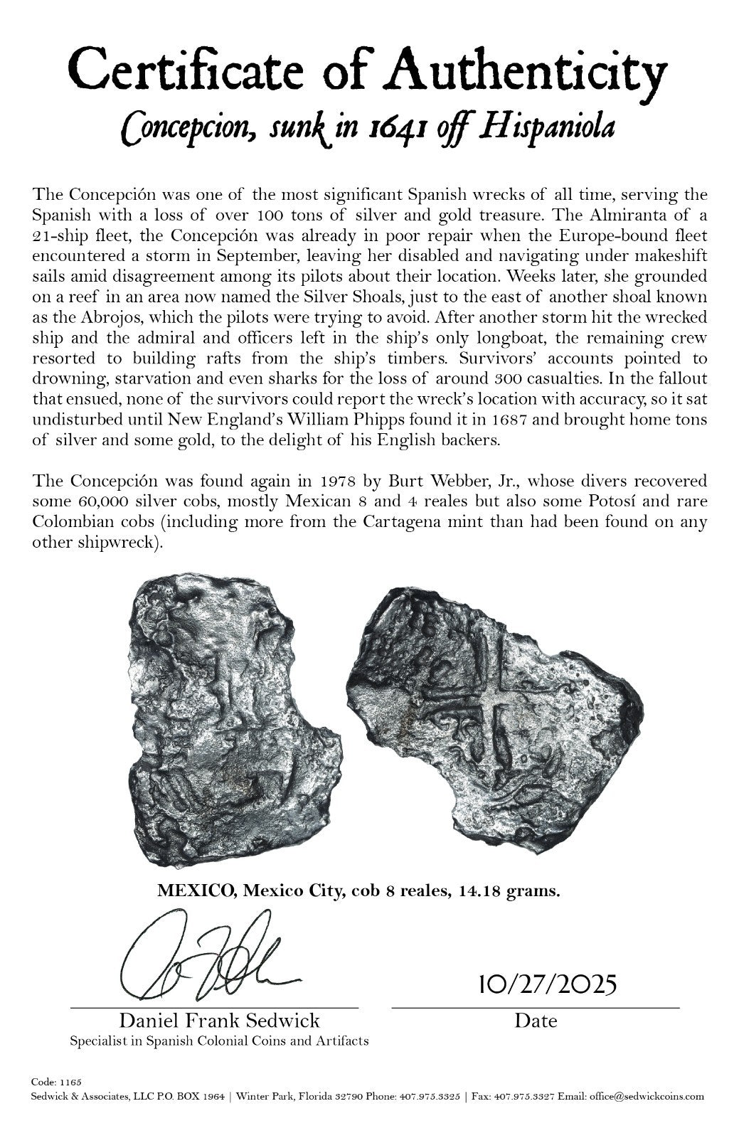Concepcion Shipwreck (1641) MEXICO Mexico City Silver Cob 8 Reales with COA 1165