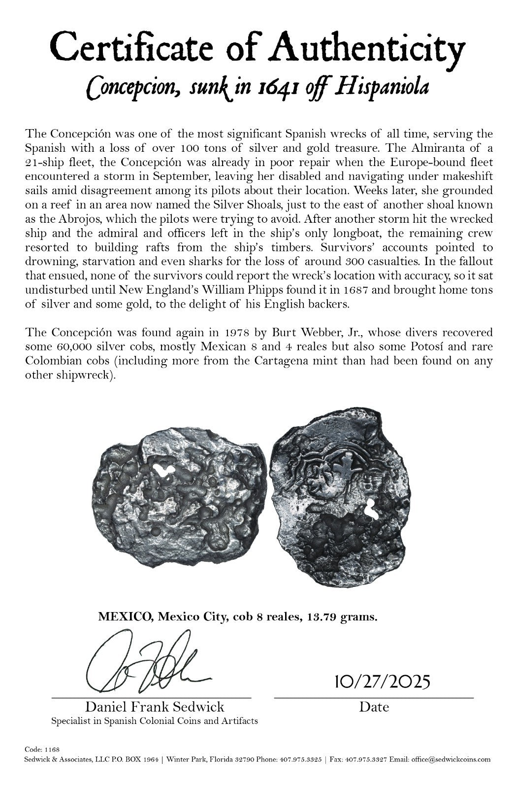 Concepcion Shipwreck (1641) MEXICO Mexico City Silver Cob 8 Reales with COA 1168