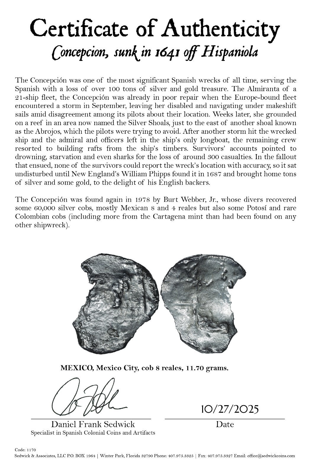 Concepcion Shipwreck (1641) MEXICO Mexico City Silver Cob 8 Reales with COA 1170
