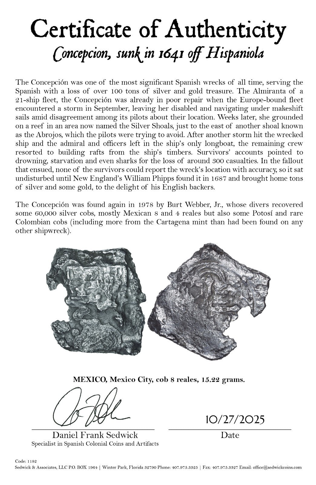 Concepcion Shipwreck (1641) MEXICO Mexico City Silver Cob 8 Reales with COA 1182