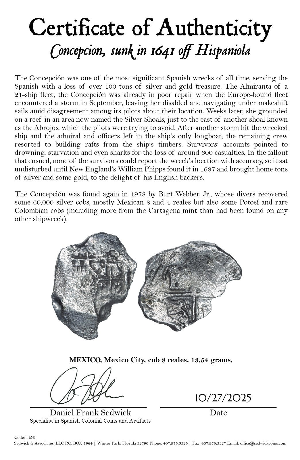 Concepcion Shipwreck (1641) MEXICO Mexico City Silver Cob 8 Reales with COA 1196