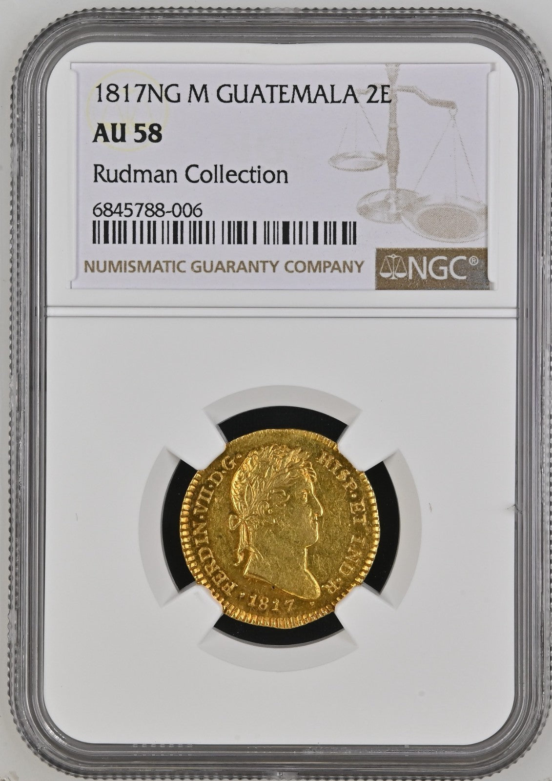 GUATEMALA, Guatemala City, gold bust 2 escudos, Ferdinand VII, 1817 M, rare, NGC AU 58, ex-Rudman.