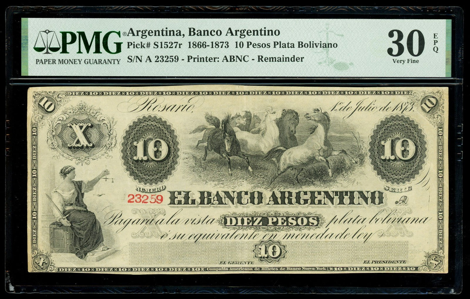 ARGENTINA, Rosario, Banco Argentino, 10 pesos remainder, 1-7-1873, serial 23259, PMG VF 30 EPQ, ex-Paper Money of Argentina Plate.