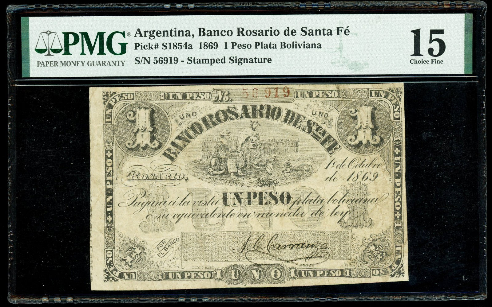 ARGENTINA, Rosario, Banco Rosario de Santa Fe, 1 peso plata boliviana, 1-10-1869, serial 56919, PMG Choice F 15, Bauman Plate.