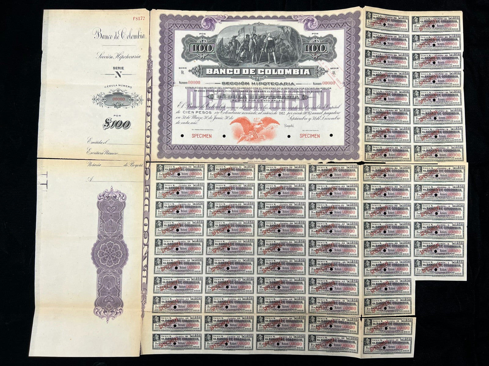 COLOMBIA, Bogotá, Banco de Colombia, 100 pesos 10-percent coupon bond specimen, 21-11-1924, series N, ex-ABNCo