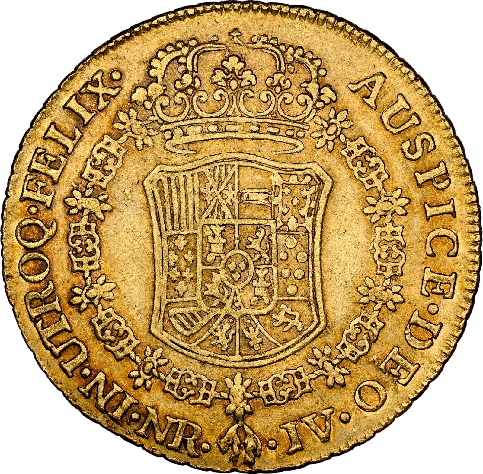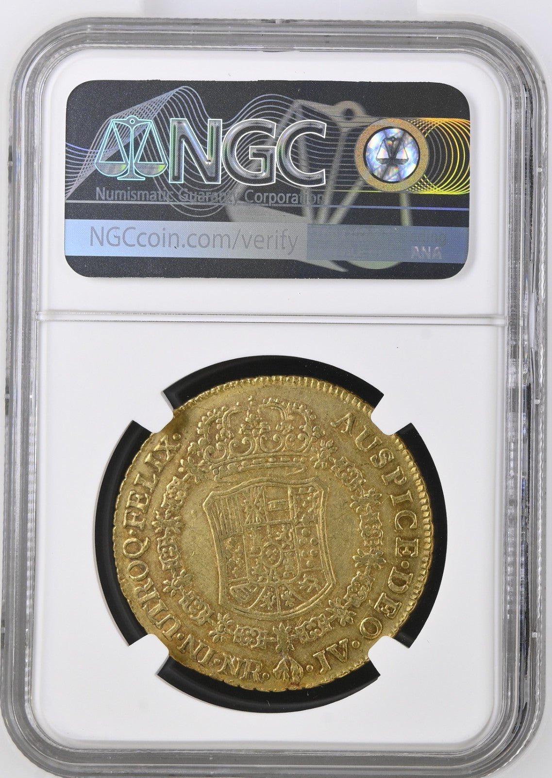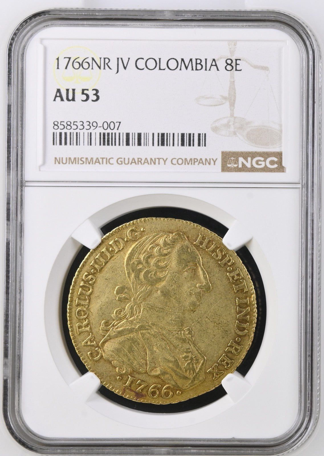 COLOMBIA, Bogotá, gold bust 8 escudos, Charles III, 1766 JV, rare, NGC AU 53