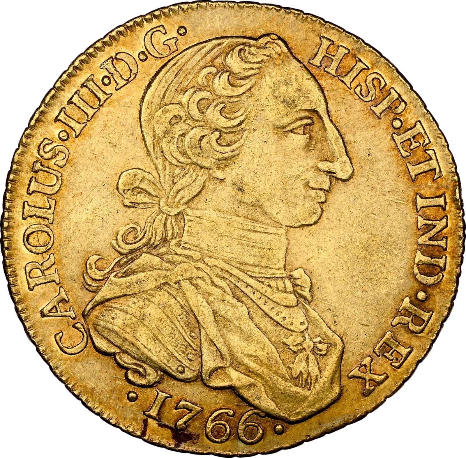 COLOMBIA, Bogotá, gold bust 8 escudos, Charles III, 1766 JV, "rat nose" bust, rare, NGC AU 53.