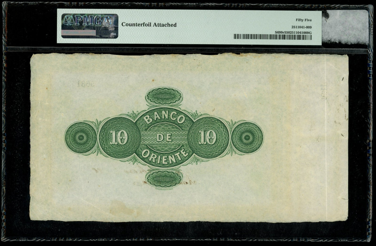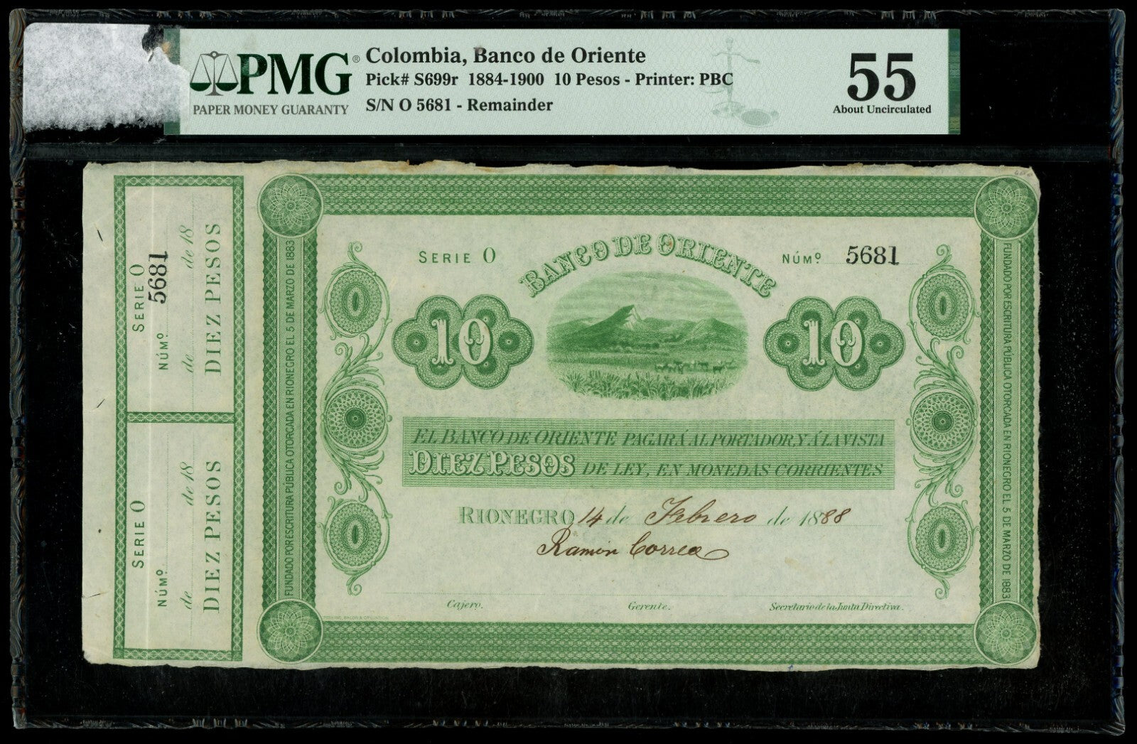 COLOMBIA, Rionegro, Banco de Oriente, 10 pesos remainder, (1884-1900), serial 5681, series O, PMG AU 55.