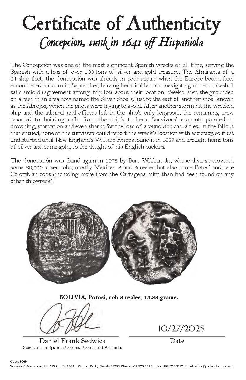 Concepcion Shipwreck (1641) BOLIVIA Potosí Silver Cob 8 Reales with COA 1049