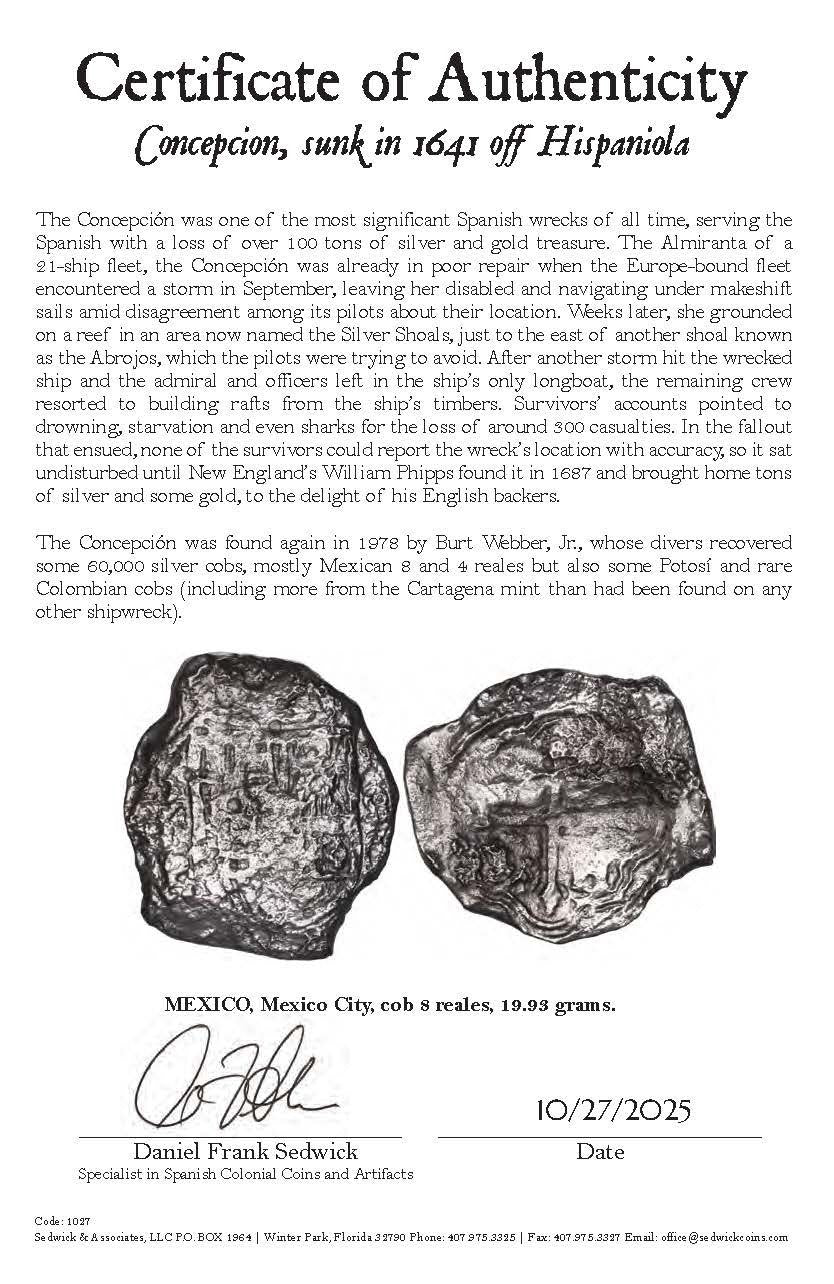 Concepcion Shipwreck (1641) MEXICO Mexico City Silver Cob 8 Reales with COA 1027