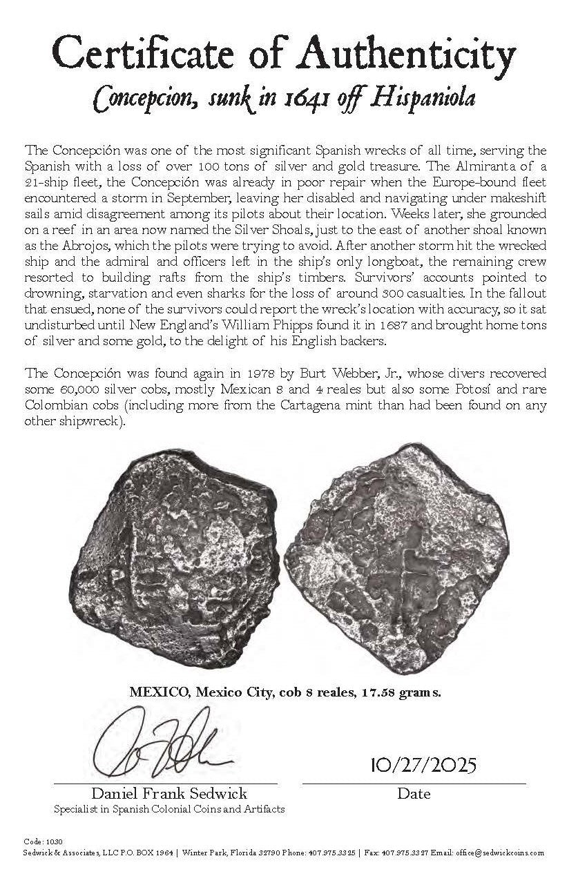 Concepcion Shipwreck (1641) MEXICO Mexico City Silver Cob 8 Reales with COA 1030